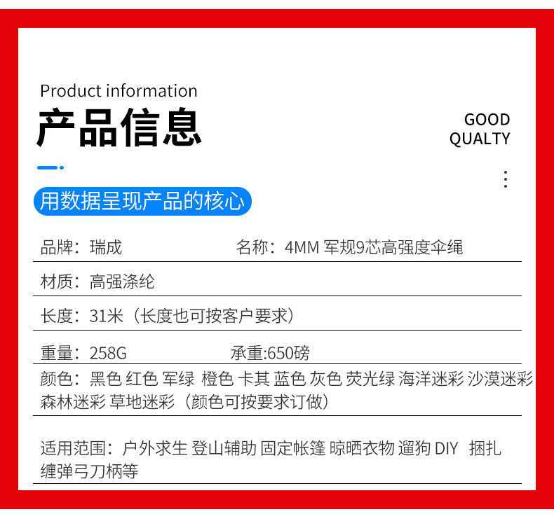 户外尼龙伞绳 全系列多功能10芯850磅伞兵绳手链刀柄缠绕七芯伞绳