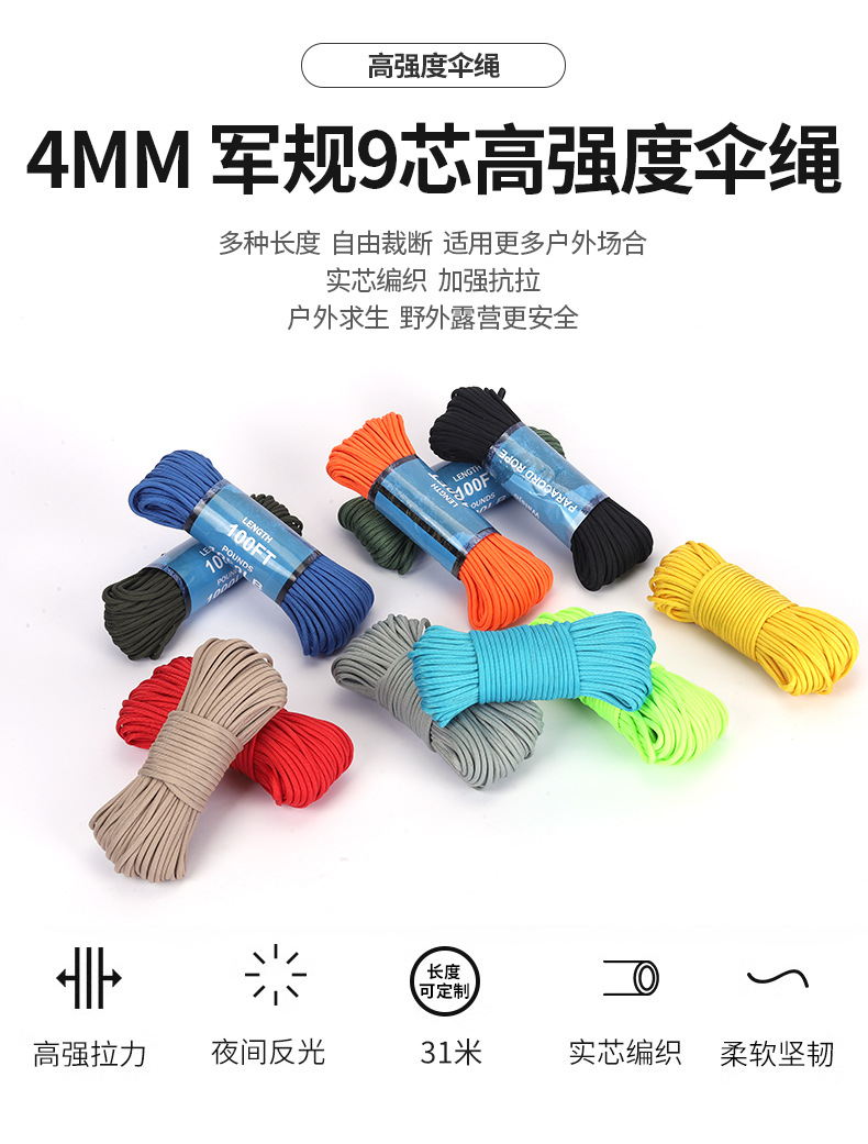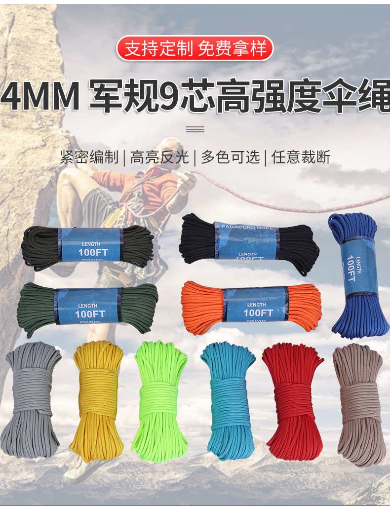4mm軍規9芯高強度傘ロープ650ポンド多機能傘ロープ屋外生存傘ロープdiy手編みロープ