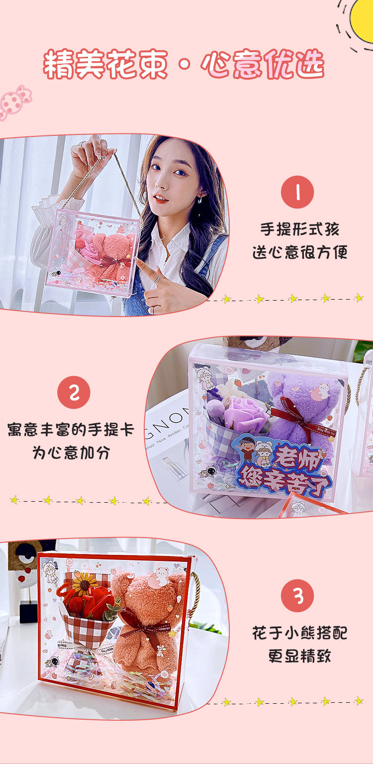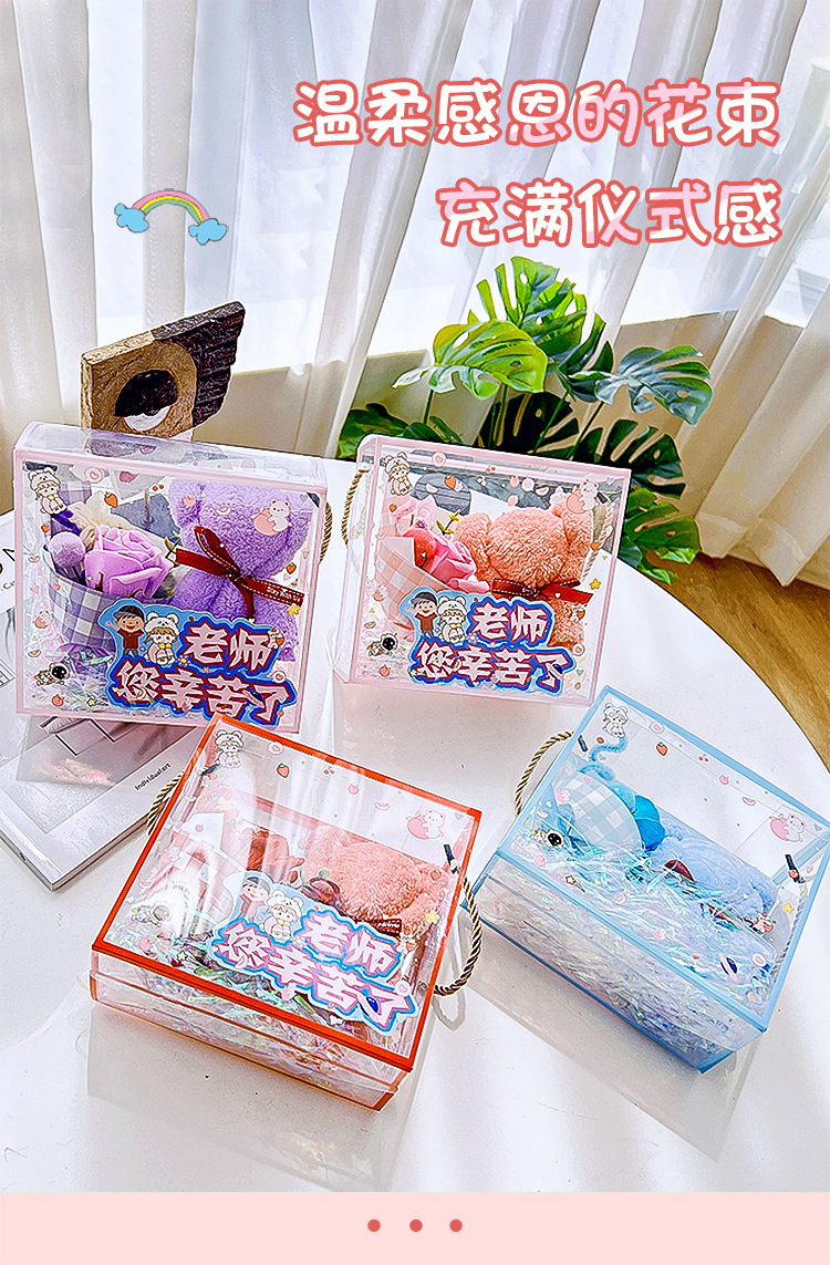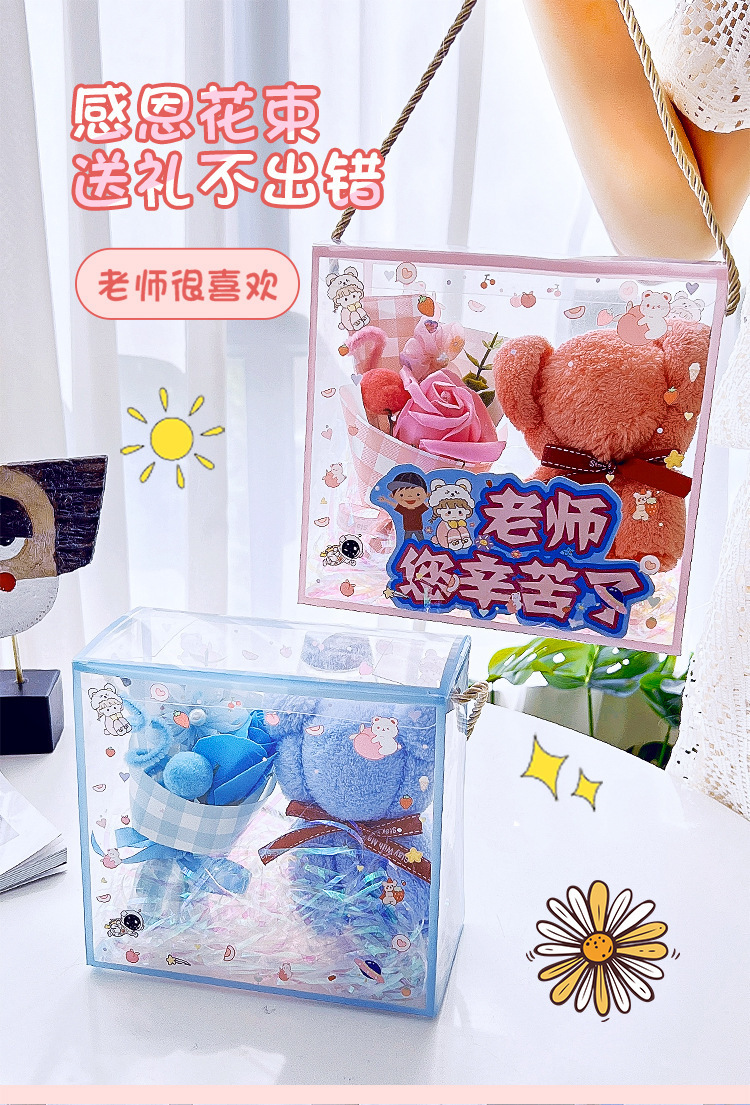 教師の日のプレゼントは草のバラの花束のアイデアの熊のタオルのプレゼント袋の幼稚園に子供のお土産を送ります。