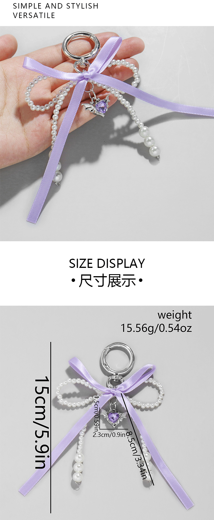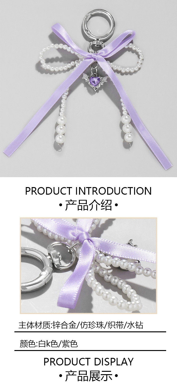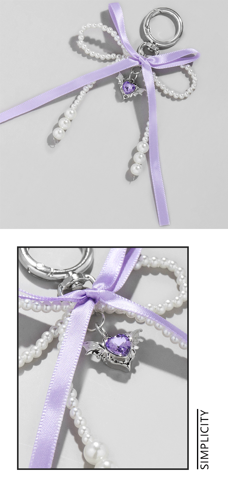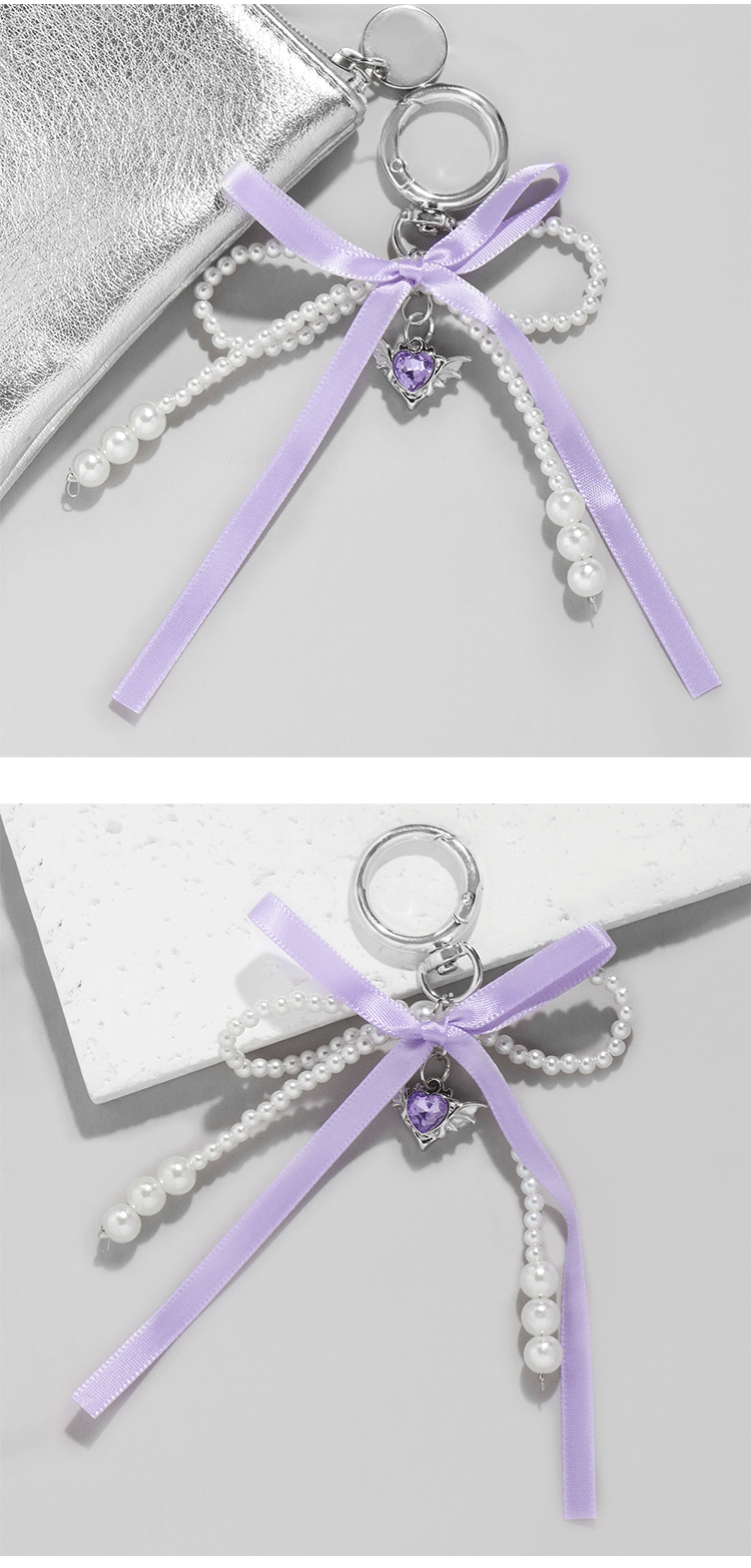 国境を越えて人気の高い、多用途でシンプルで軽やかな高級感漂う風合いのイミテーションパール、紫色のリボン、蝶結び、羽根、ハート型のペンダントキーホルダー