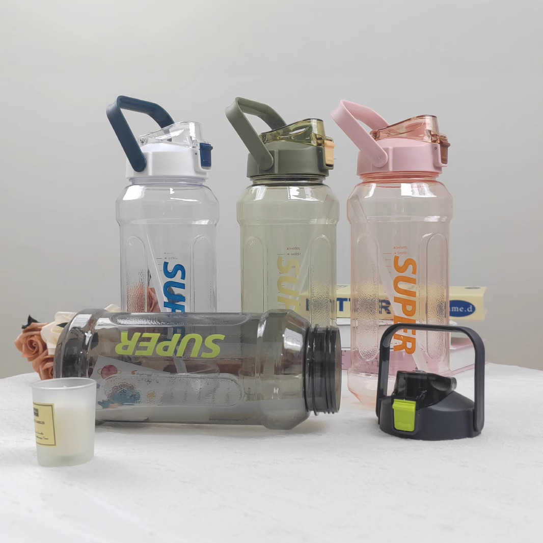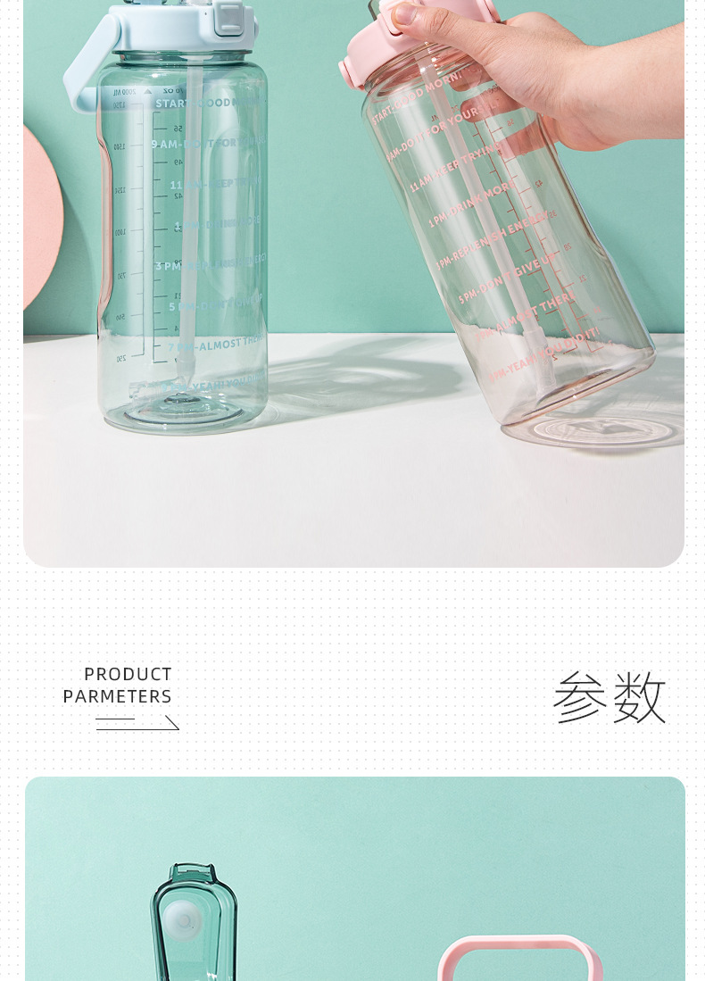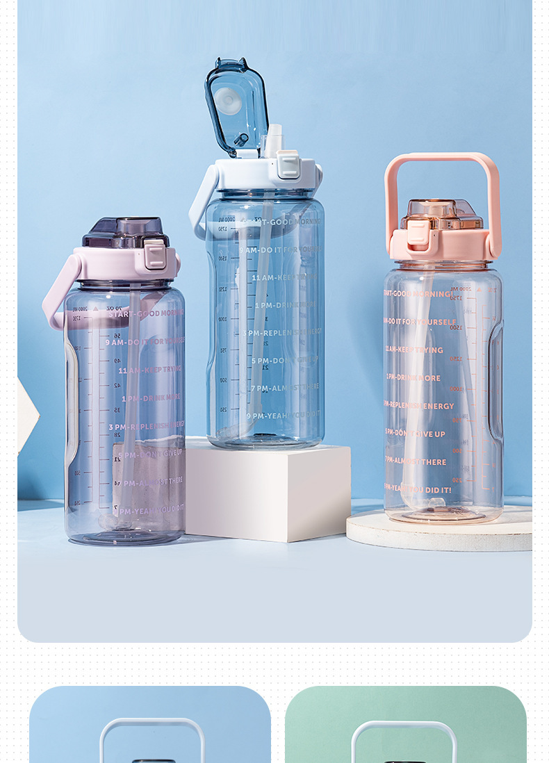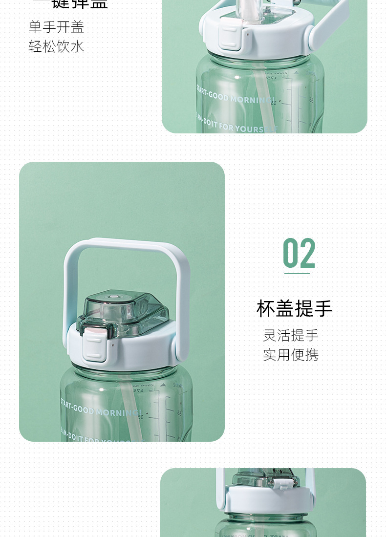 跨境2000ml塑料水杯吸管透明太空杯防摔便携提手户外运动健身水壶