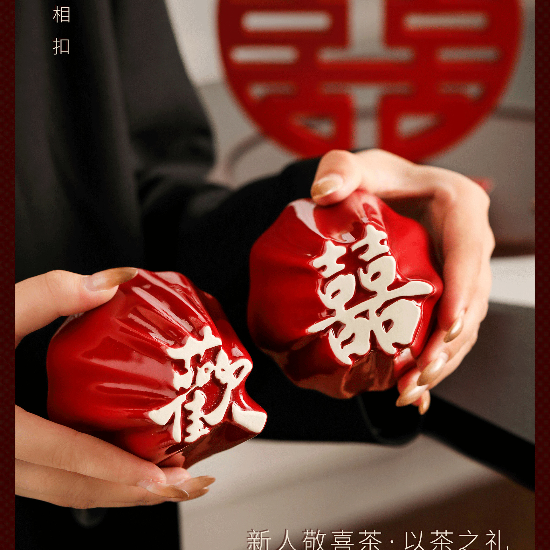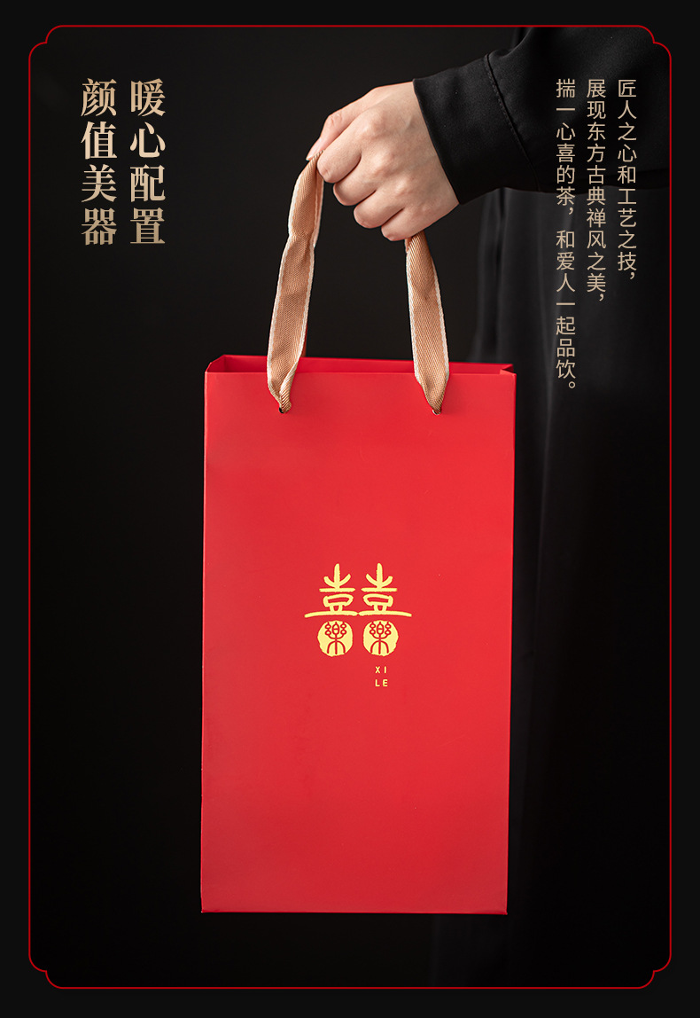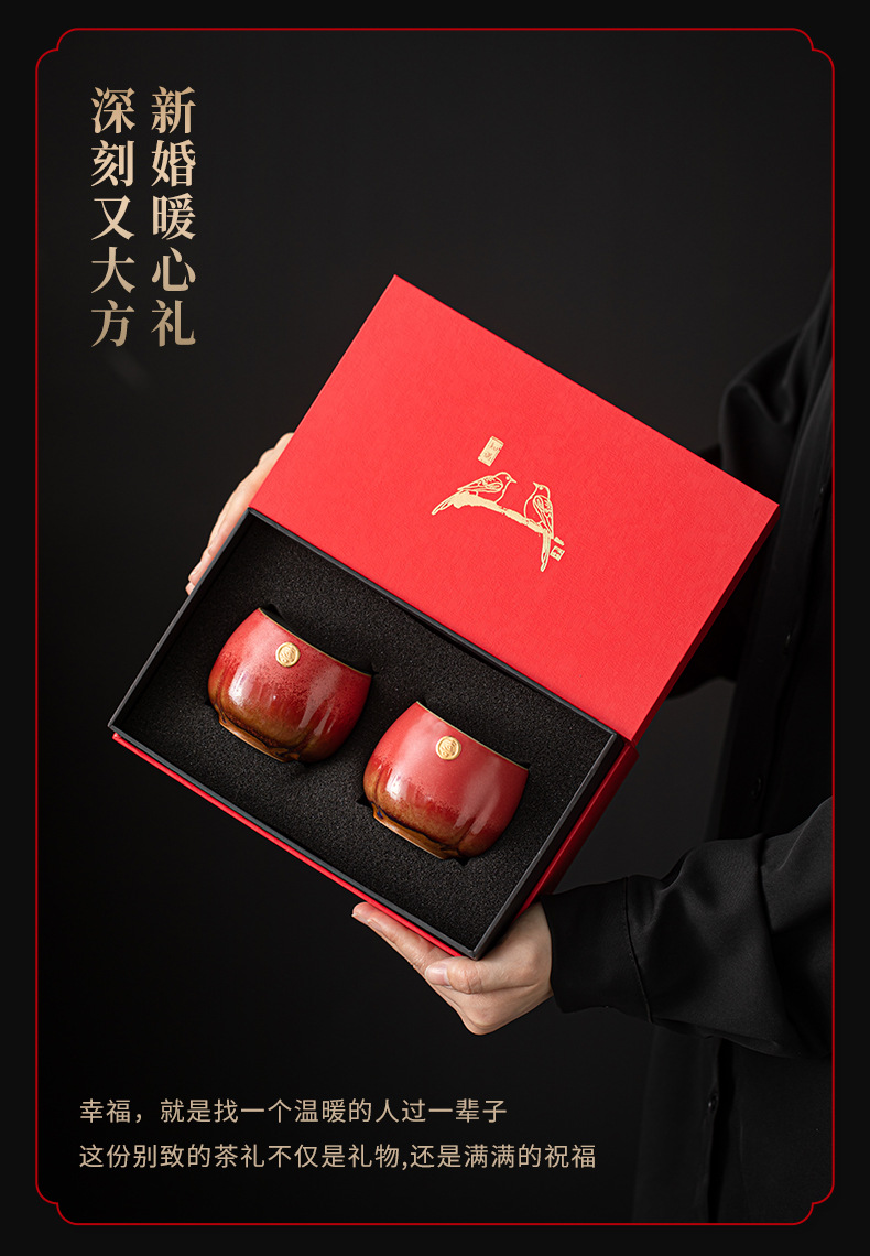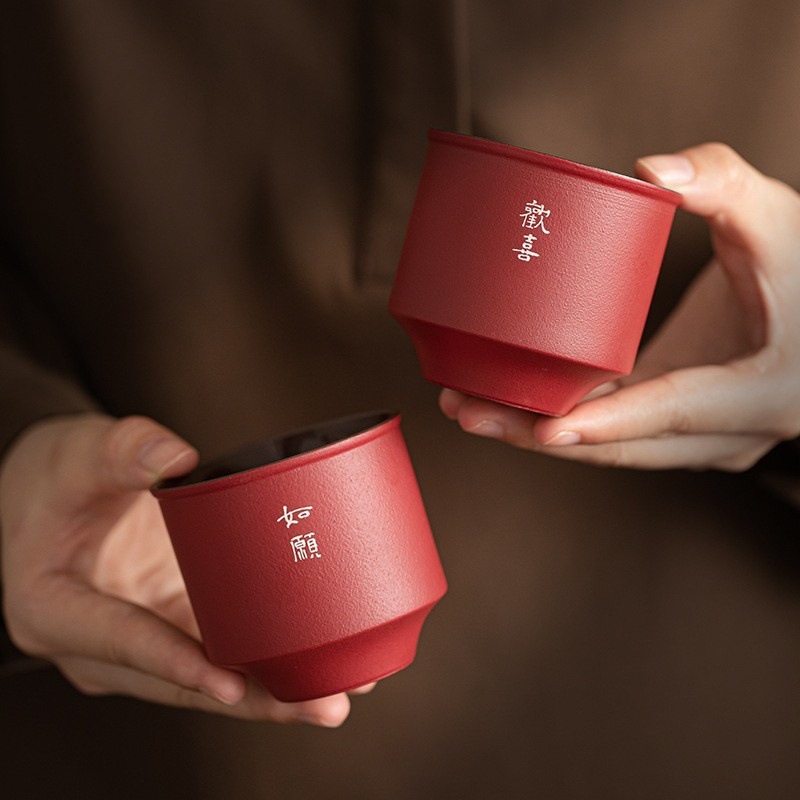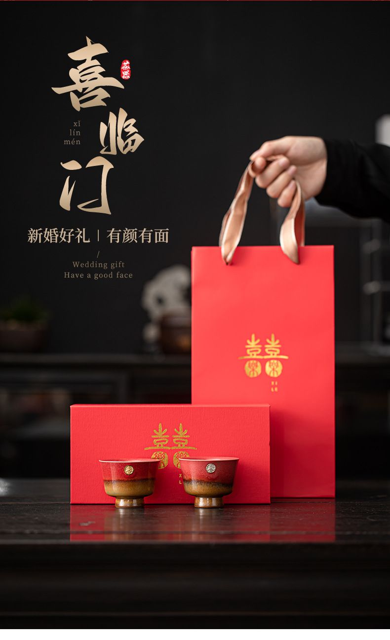 文創双喜紅喜字茶杯手作り描金大陶磁器敬茶杯結婚祝いカップル対杯お土産
