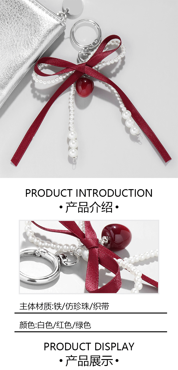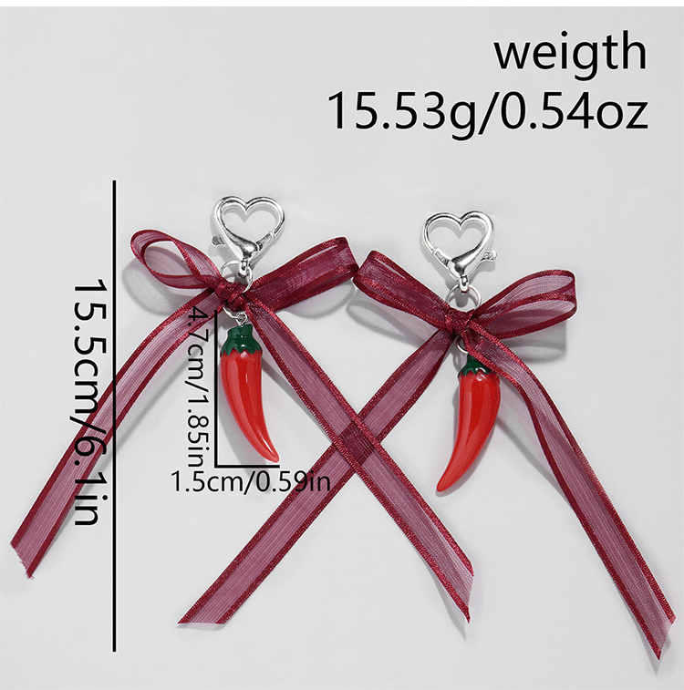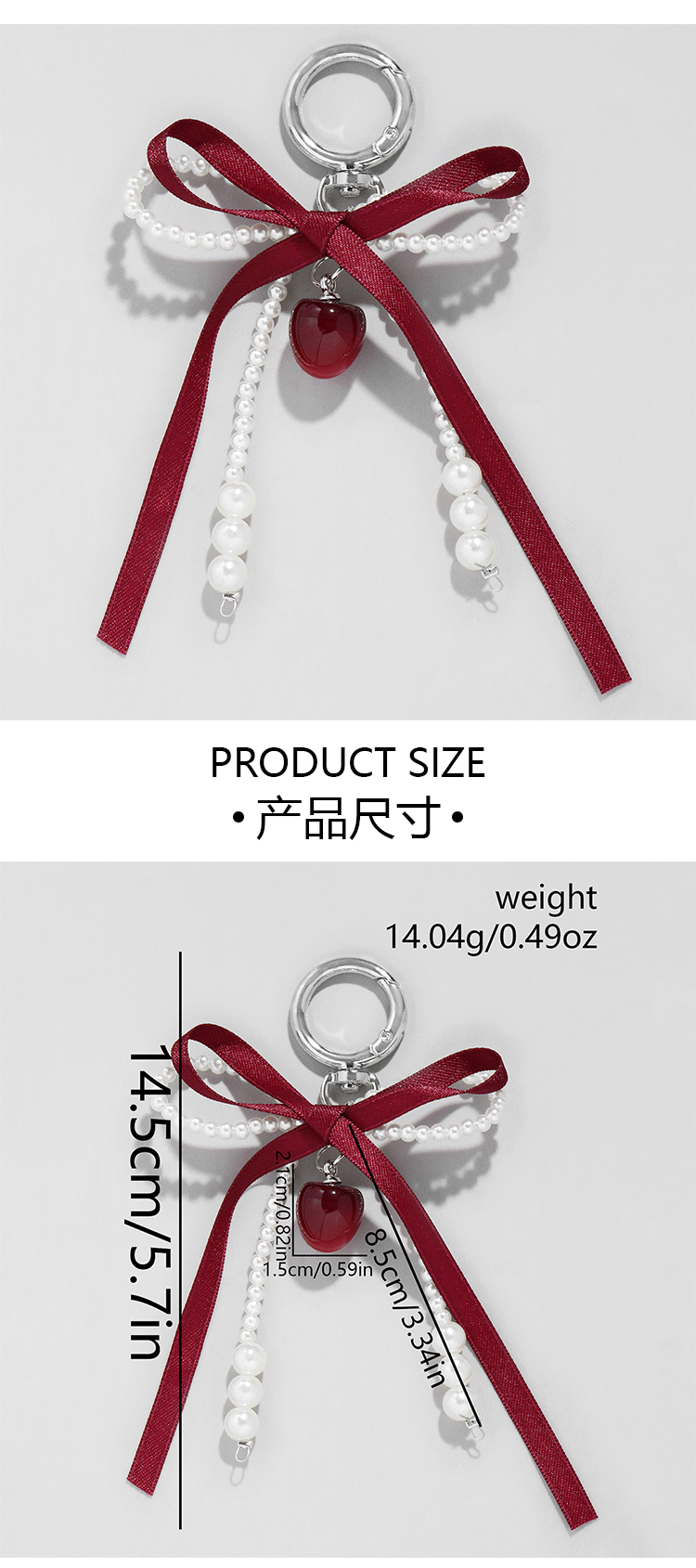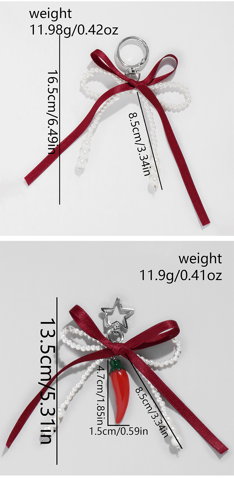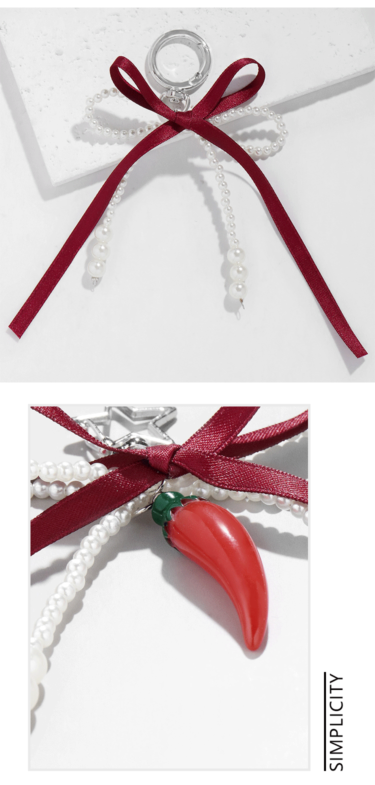 シンプルな透明な網糸は真珠の蝶結びのワインの赤いリボンの愛の星のさくらんぼの赤い唐辛子のキーホルダーをまねます。
