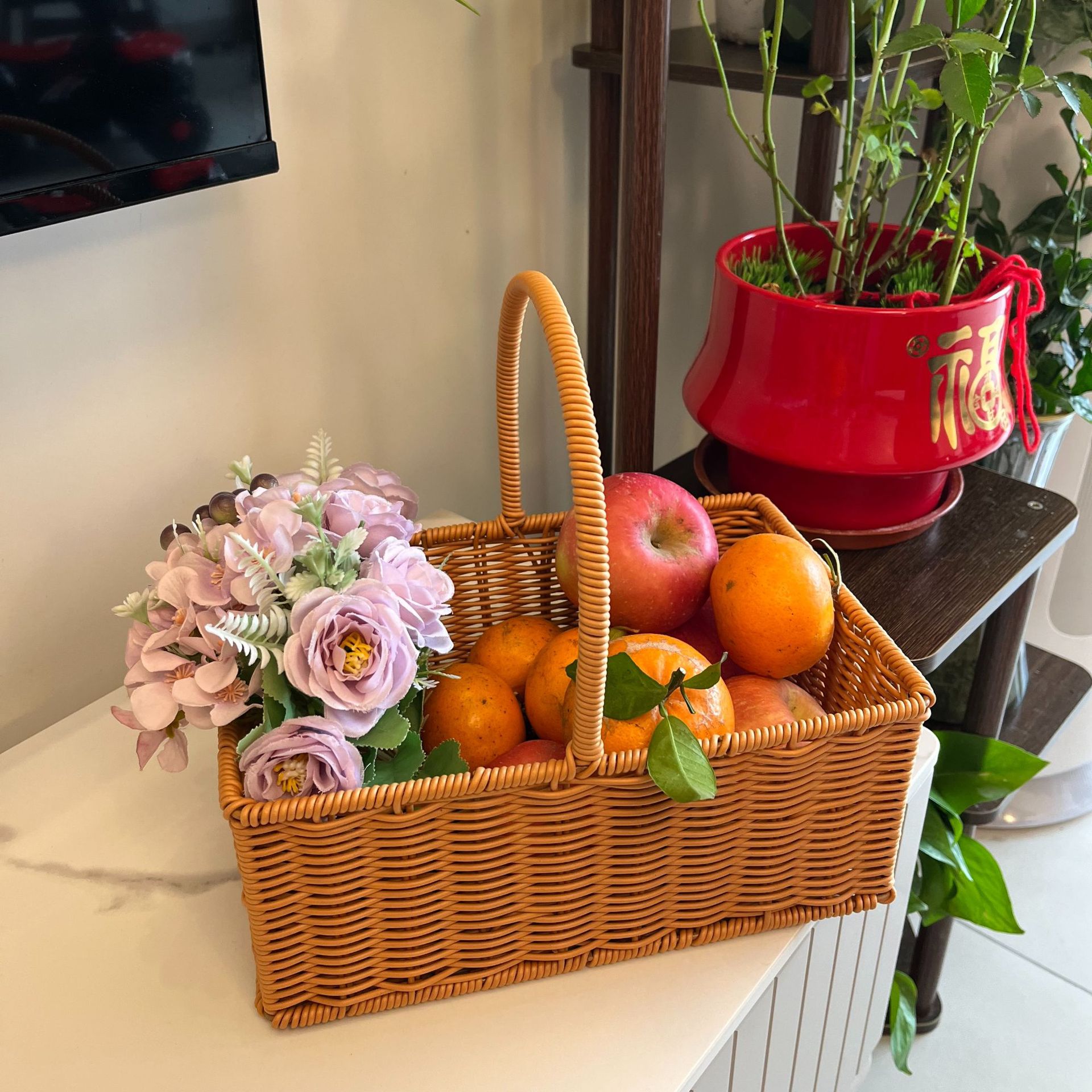 新款方形手提篮仿藤编织田园花艺插花插水果礼品篮喜庆糖果收纳篮