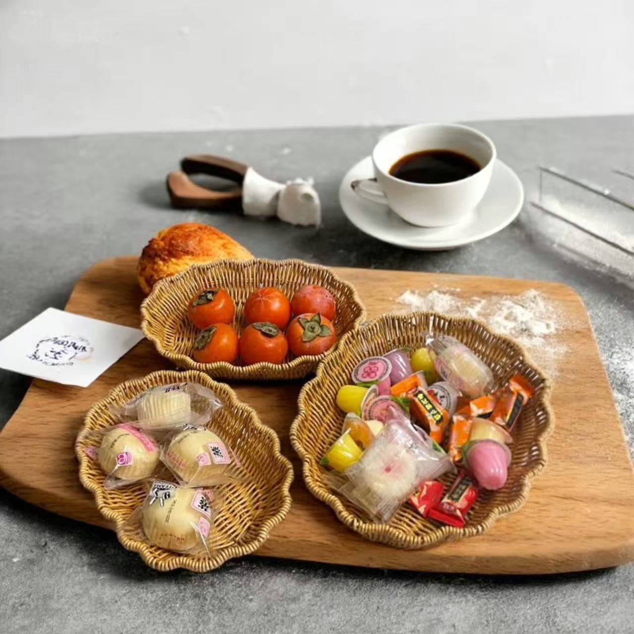 新しい花とフルーツプレート模造籐織りフルーツプレートスナックバスケットスナック雑貨キャンディー収納バスケットドライフルーツスナックプレート