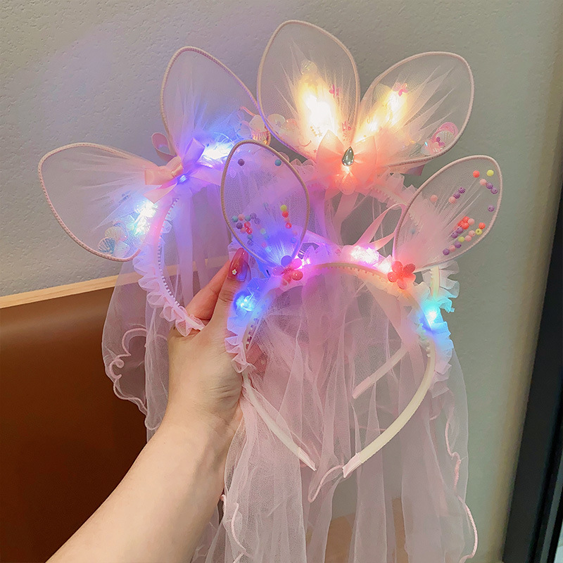 子供用ライト付きヘアフープ、小さな女の子用点滅ライト、超かわいいウサギの耳ヘアピン、ヘッドドレス、プリンセスリボン、ベールヘアアクセサリー