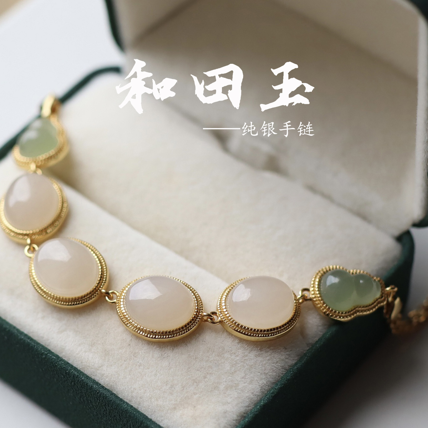 天然和田玉藕粉手链S925纯银镶嵌大蛋面葫芦现货批发高端礼品货源