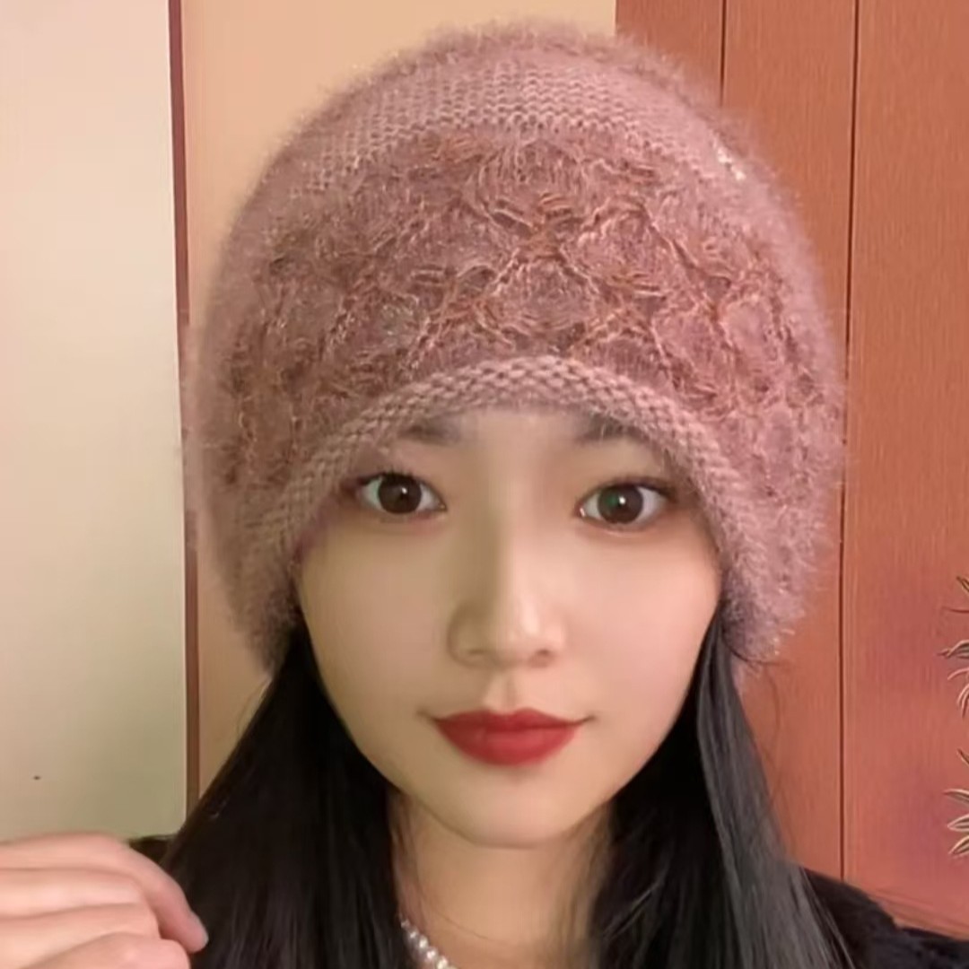 秋冬时尚保暖女士针织保暖松鼠绒毛线帽包头帽优雅镂空花针织帽
