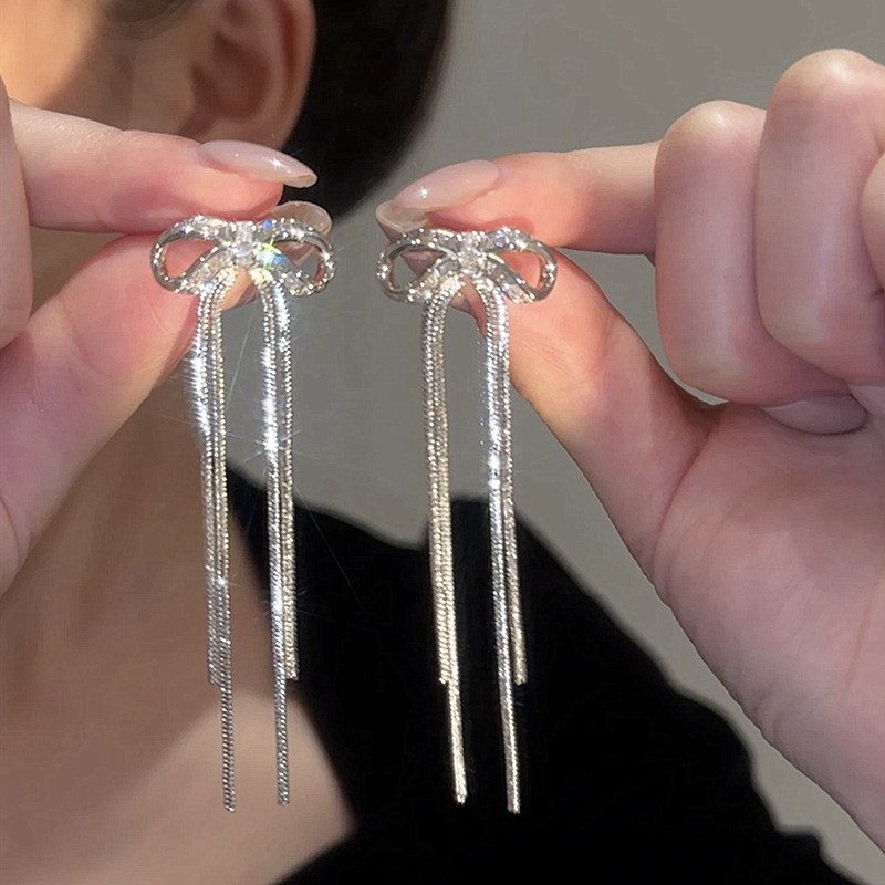 ジルコンの蝶結びのフリンジイヤリングs 925銀の針は軽くて豪華です。