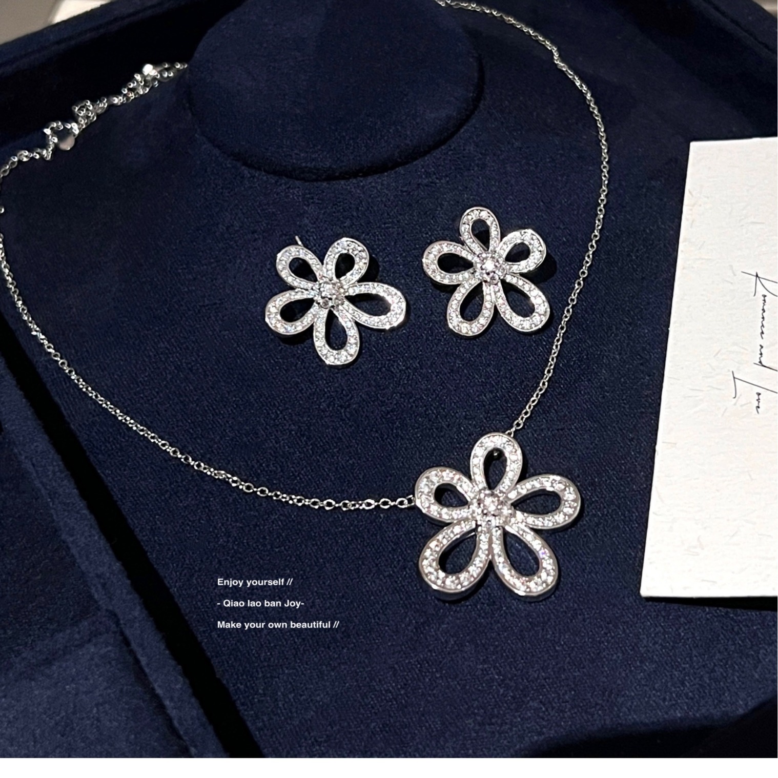 小型ジルコンのダイヤモンドいっぱいの大きな花のネックレスの銀色の花びらのイヤリングの鎖骨のセットの高級な軽豪華なフラッシュ