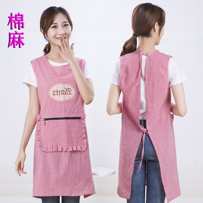 棉麻围裙厨房家用背带透气洋气做饭上班时尚拉链防污围腰工作服