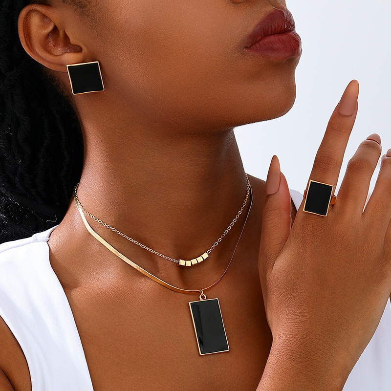 1セットのファッション欧米のパーティー風の金属の幾何学の黒い四角は女性のイヤリングのネックレスの指輪のアクセサリーのセットをかぶせます。