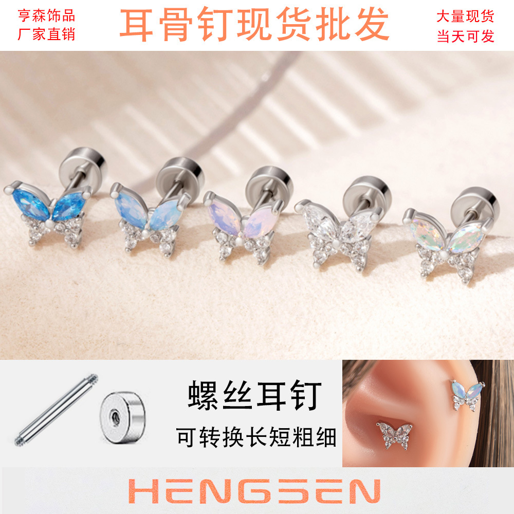 亨森蝶チタン鋼耳骨釘ピンクジルコン愛蝶ネクタイねじピアス高級感小衆耳飾り