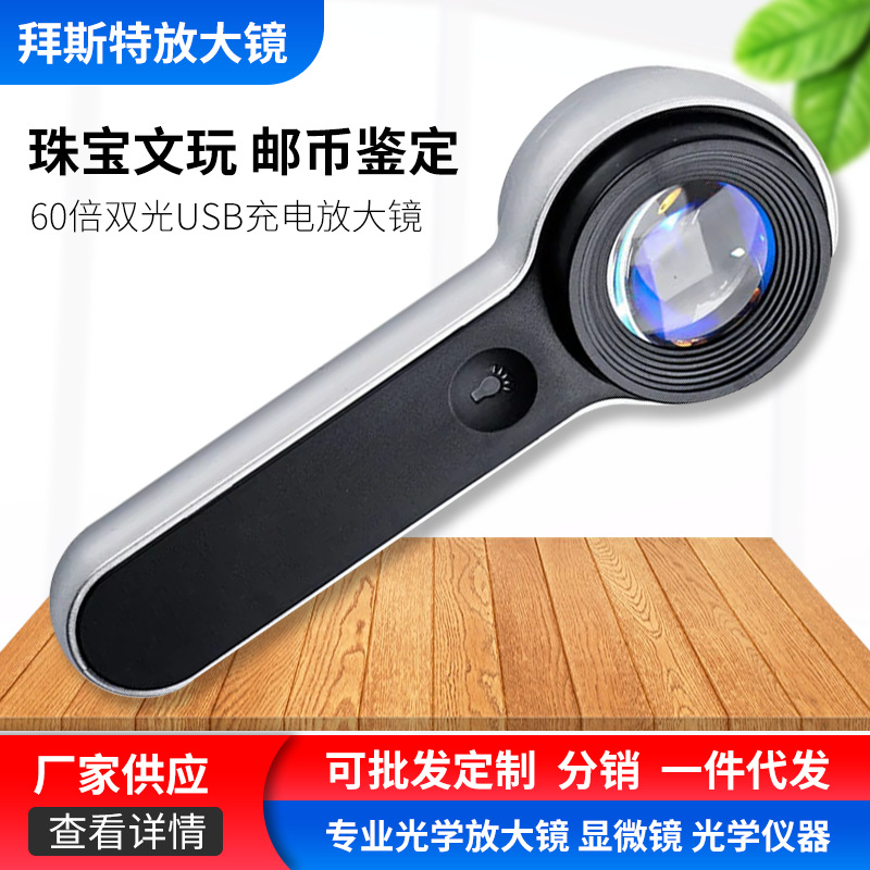 メーカー製LED拡大鏡卸売 60倍携帯用USB充電式LEDライト付き白紫二重光拡大鏡 8066