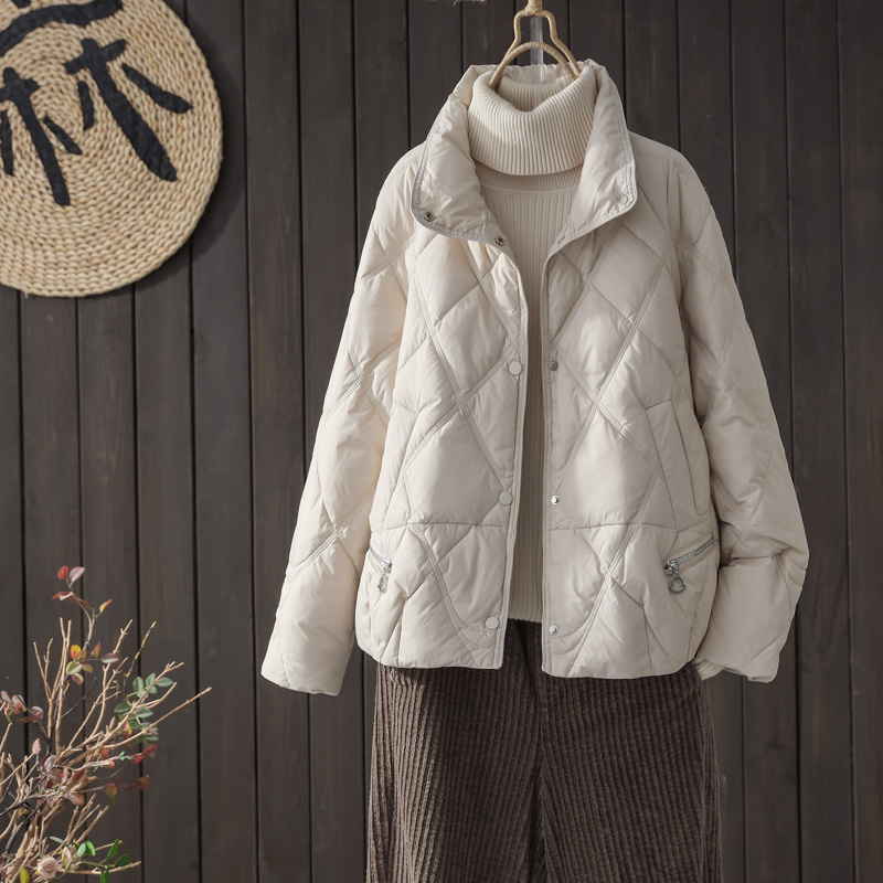 冬用スタンドカラー白ダックダウンジャケット レディース 2025年新作 韓国風菱形格子柄 カジュアル 防風 無地ショートコート
