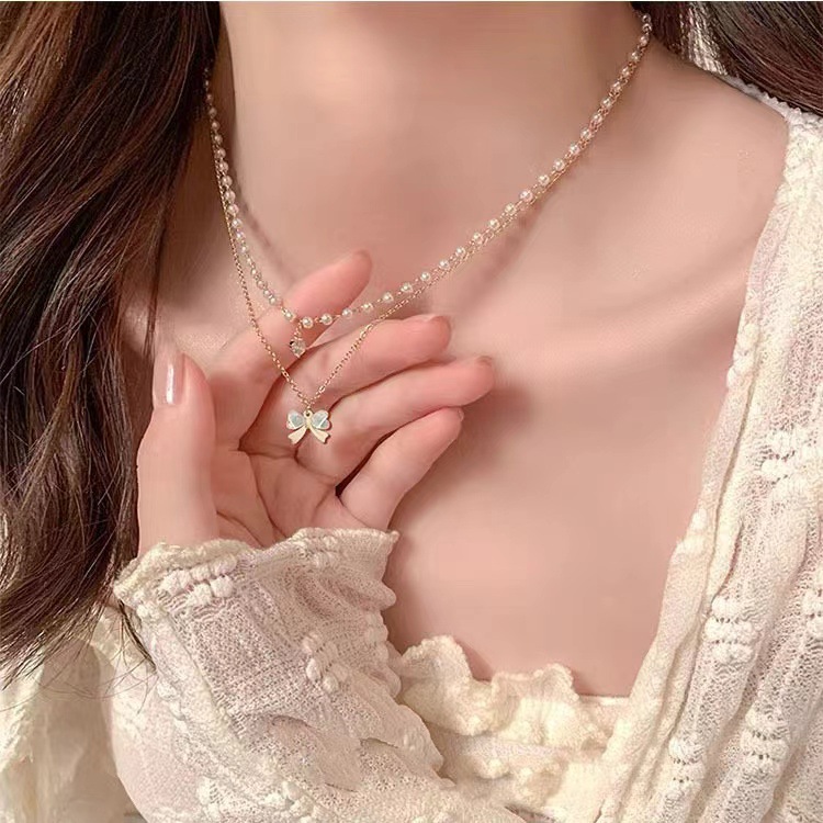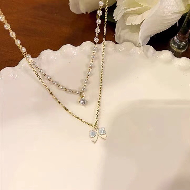 人気の軽い贅沢な積層真珠のネックレスをつけています。