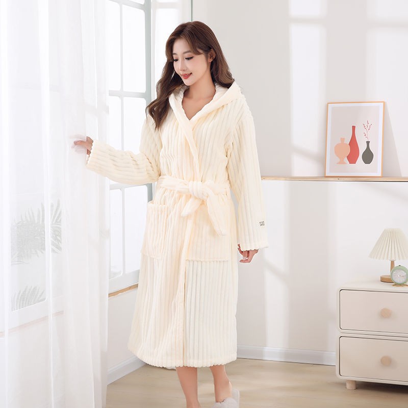 新しい秋冬の寝衣の家の服のバスローブの長いタイプの厚い縞のサンゴの毛の吸水のパジャマの通気性のゆったりしているパジャマ