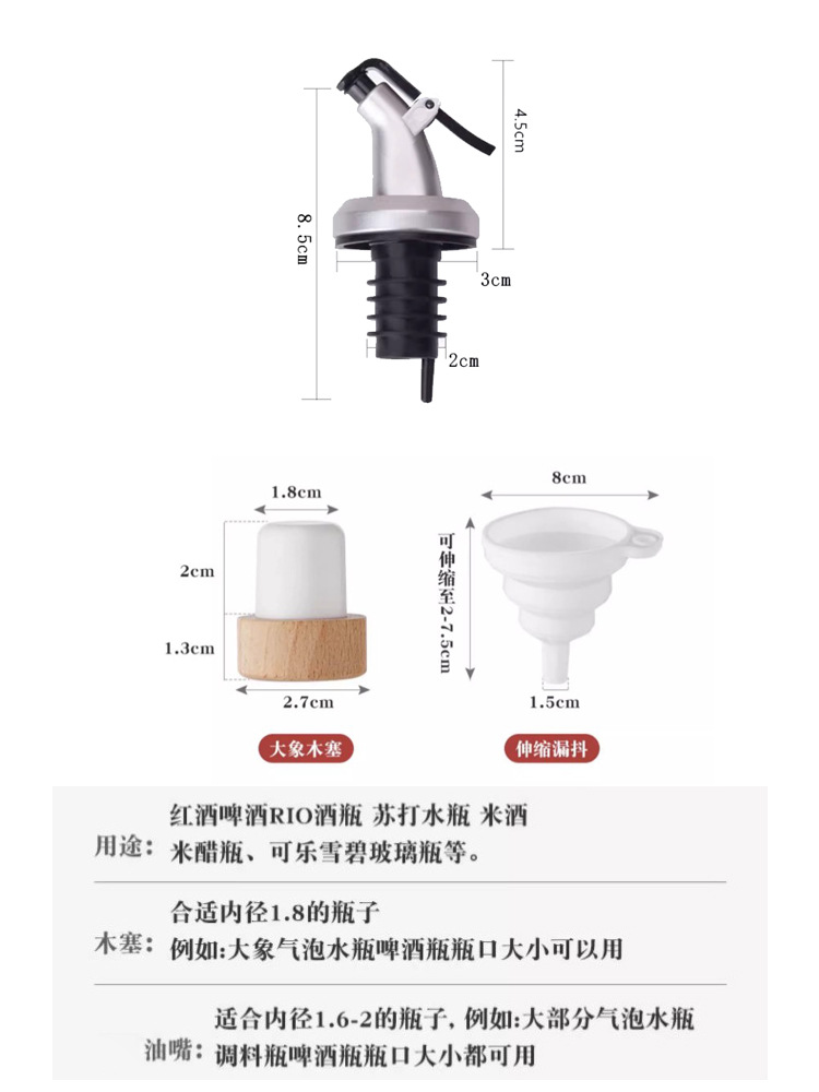 仕様 象の木の栓,折り畳み漏斗,黒い調味料瓶の流れ口