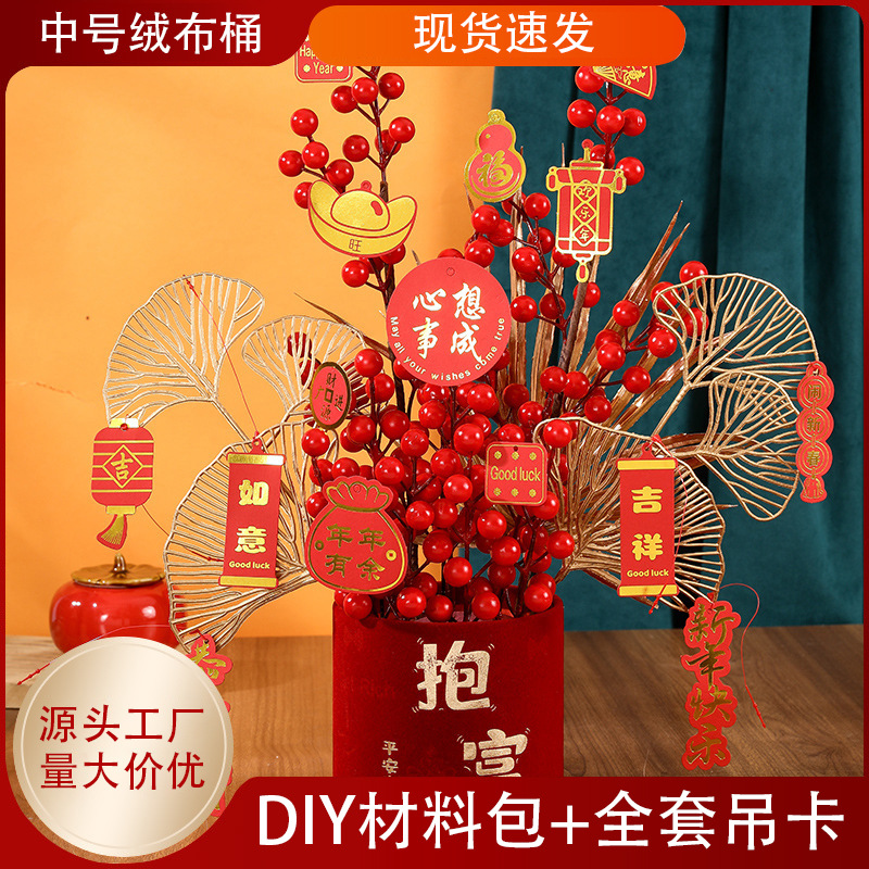 新年飾り物、年越し花、ベルベット製中型福桶DIY素材パック、幸運の赤い果物、春節飾り、新築祝い