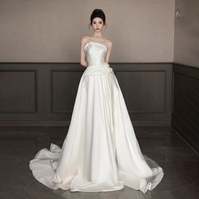サテンのウェディングドレス 2025 新しいブライダルシンプルなフォレストスタイルのスーパーフェアリーウェディングドレス気質スリムフレンチチューブトップドレス