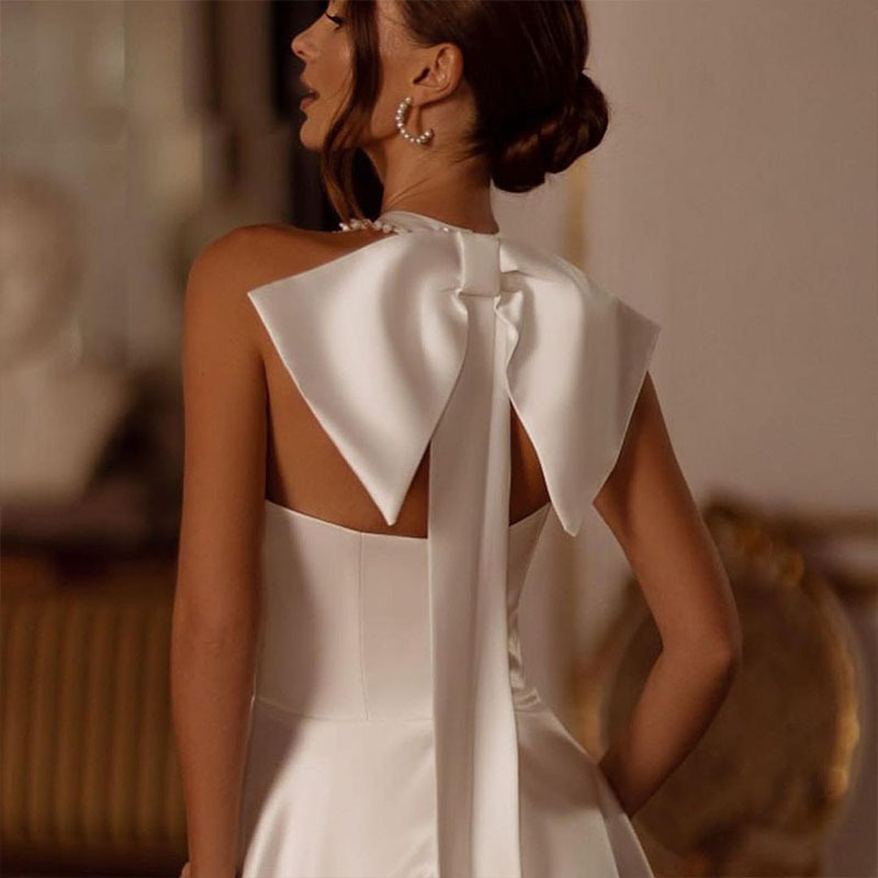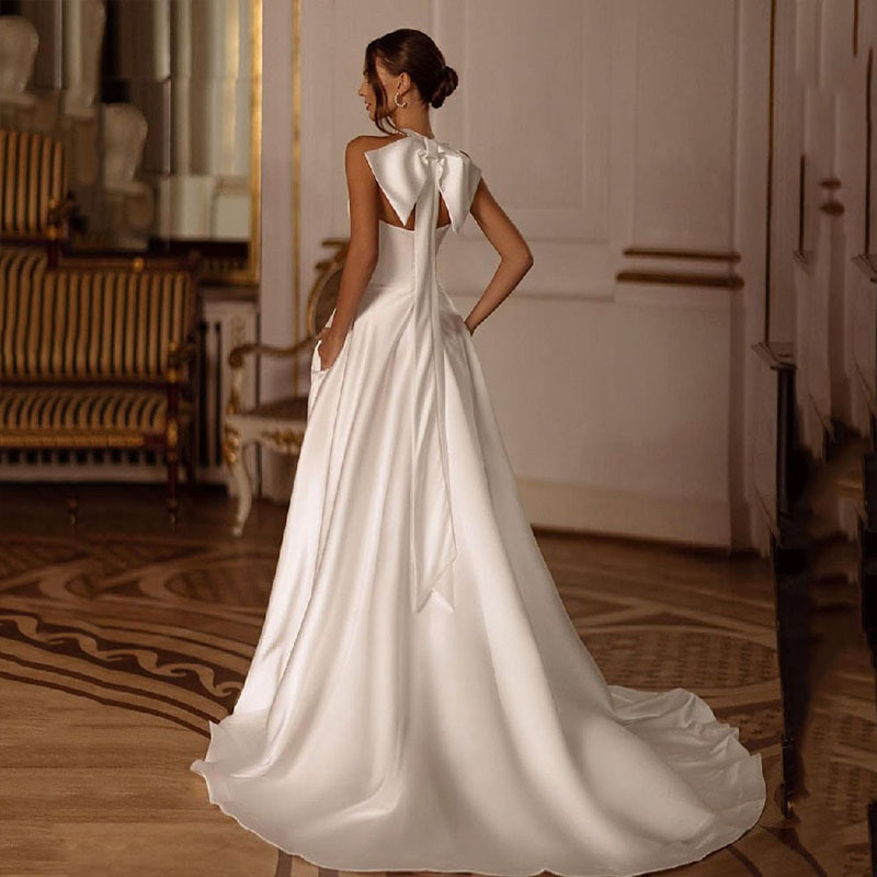 シンプルなサテンのホルターネック、上品なウェディングドレス、新作フレンチレトロなトレーン付き、お出かけ用ドレス、宴会用ドレス