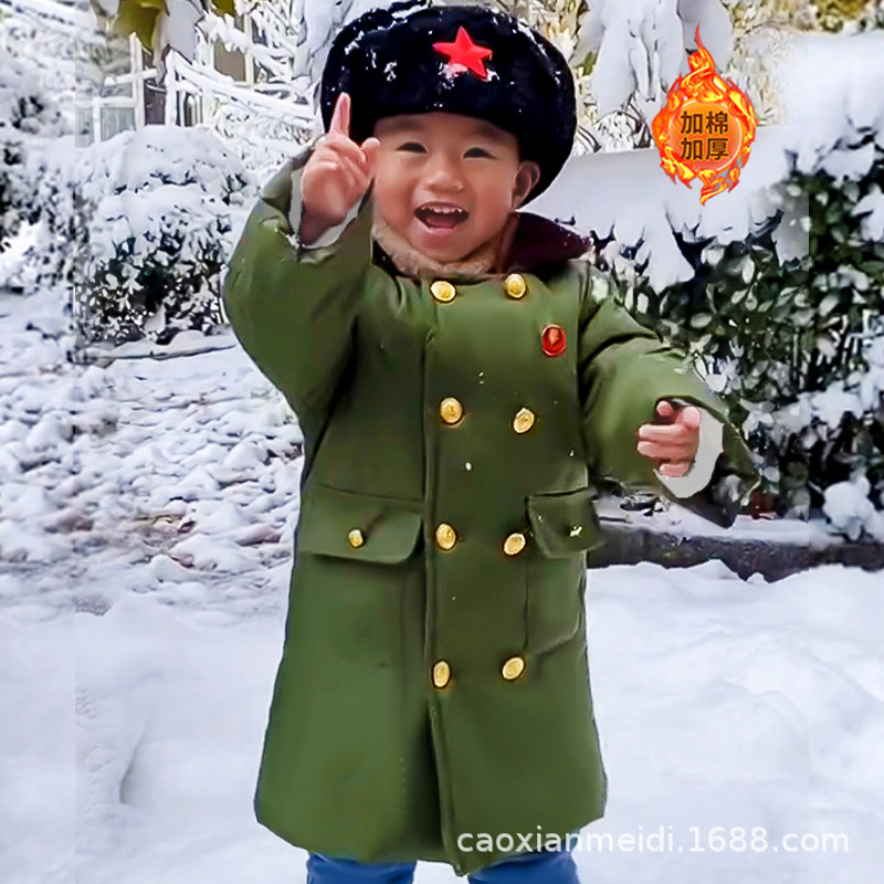 子供軍の緑の綿のコートとベルベットの厚い綿の服の子供の冬の保温綿入れの上着は雷鋒帽の赤いマフラーを送ります。