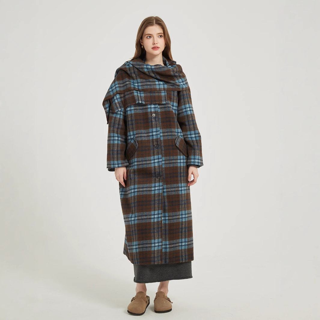 クロスボーダー婦人服卸売欧米風ゆるいカジュアル格子コート秋冬新作マフラー付きラシャコートロングタイプ