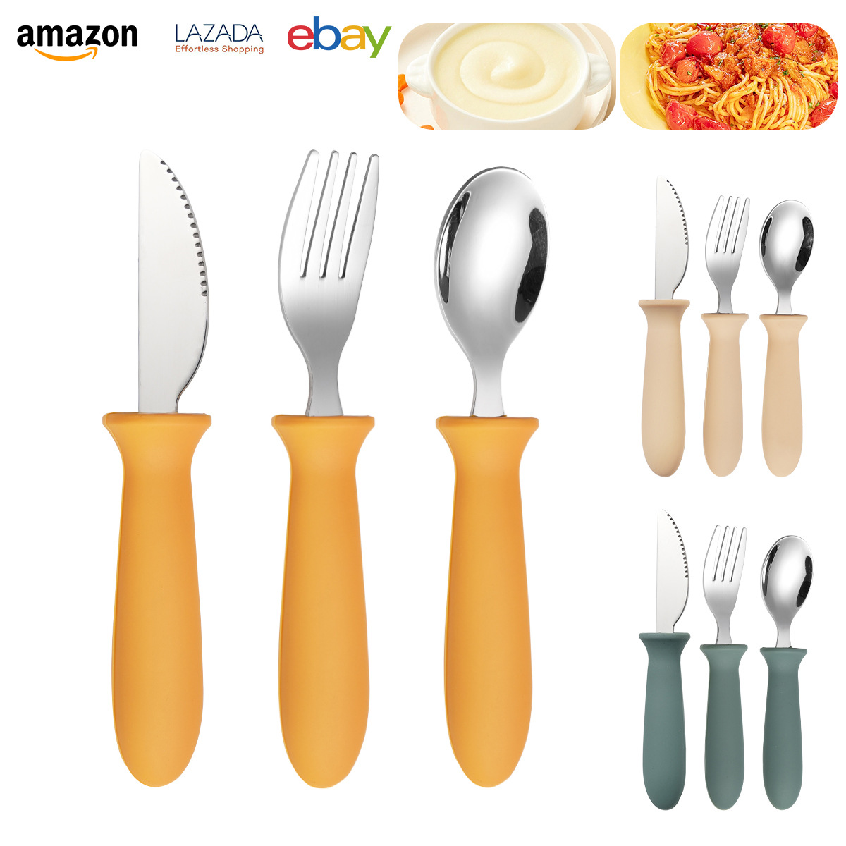 アマゾン304ステンレス子供ナイフフォークスプーン3点セットシリコンハンドル赤ちゃん食事子供西洋食器セット