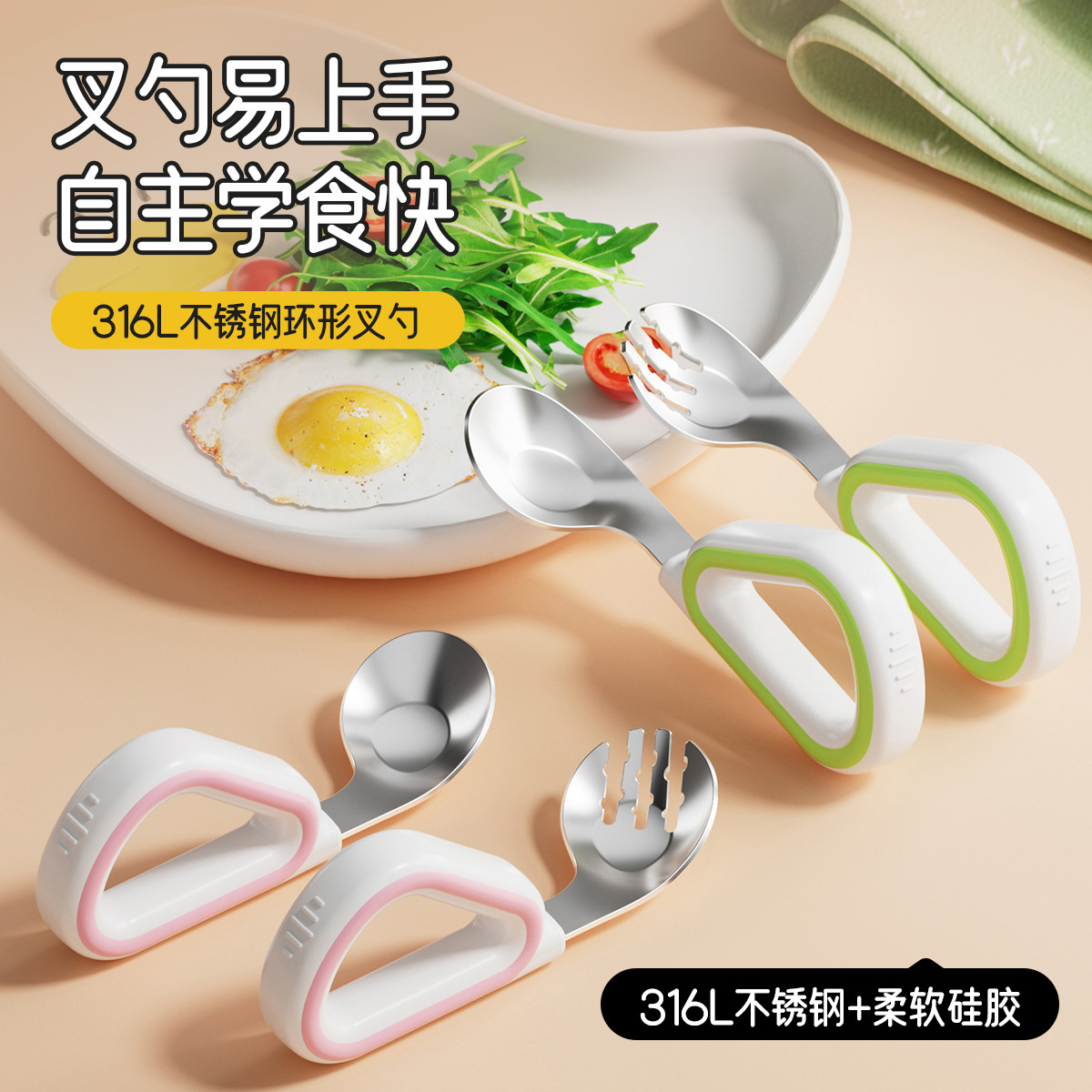 シリコンハンドル赤ちゃんトレーニングフォークスプーン元宝スプーン316ステンレスエルボーフォーク赤ちゃん補助スプーン卸売り