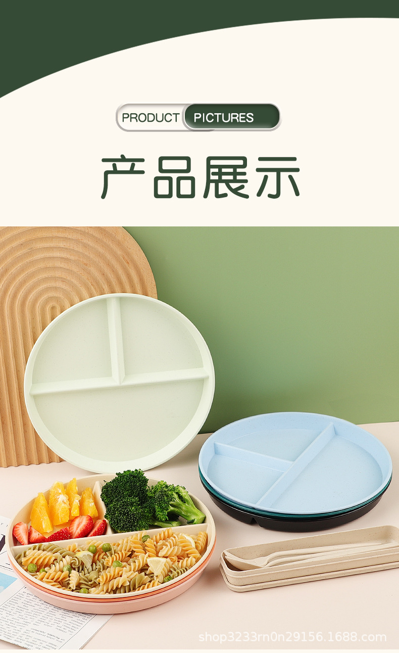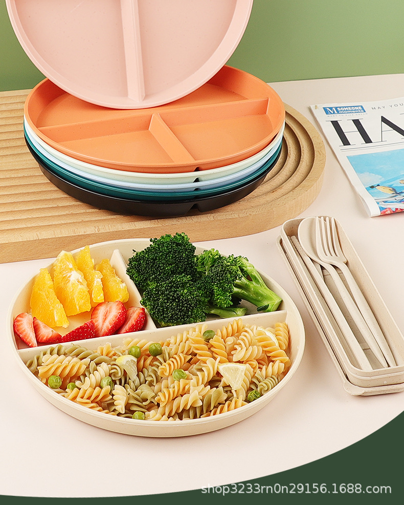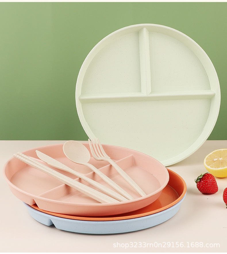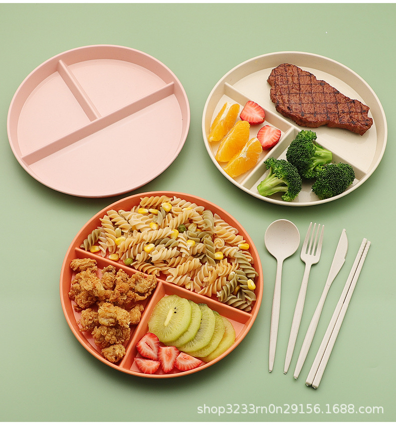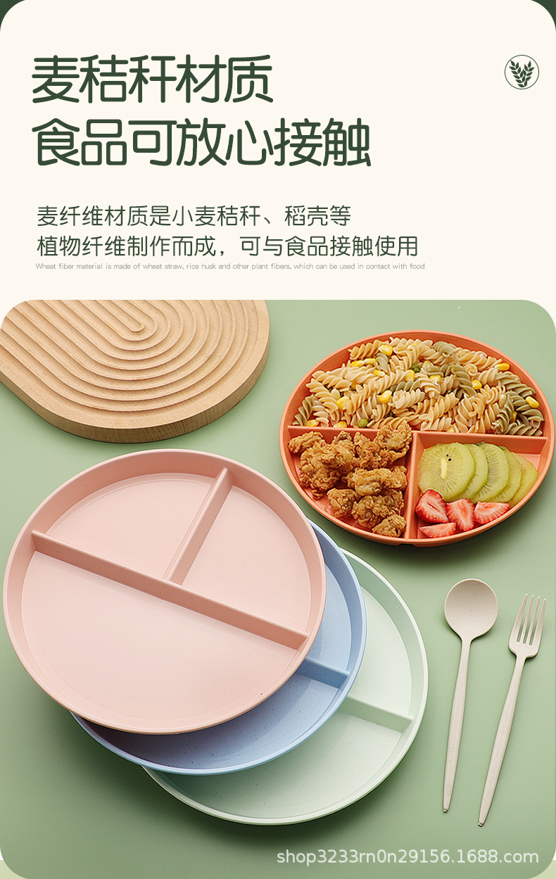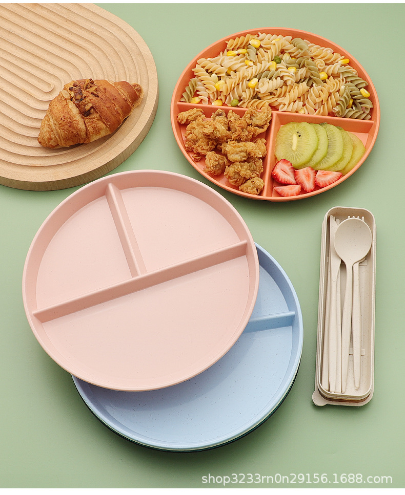 小麦わらの食事皿の丸い三段の仕切り皿の落下防止家庭用プラスチック皿の段のお菓子の朝食皿の果物皿