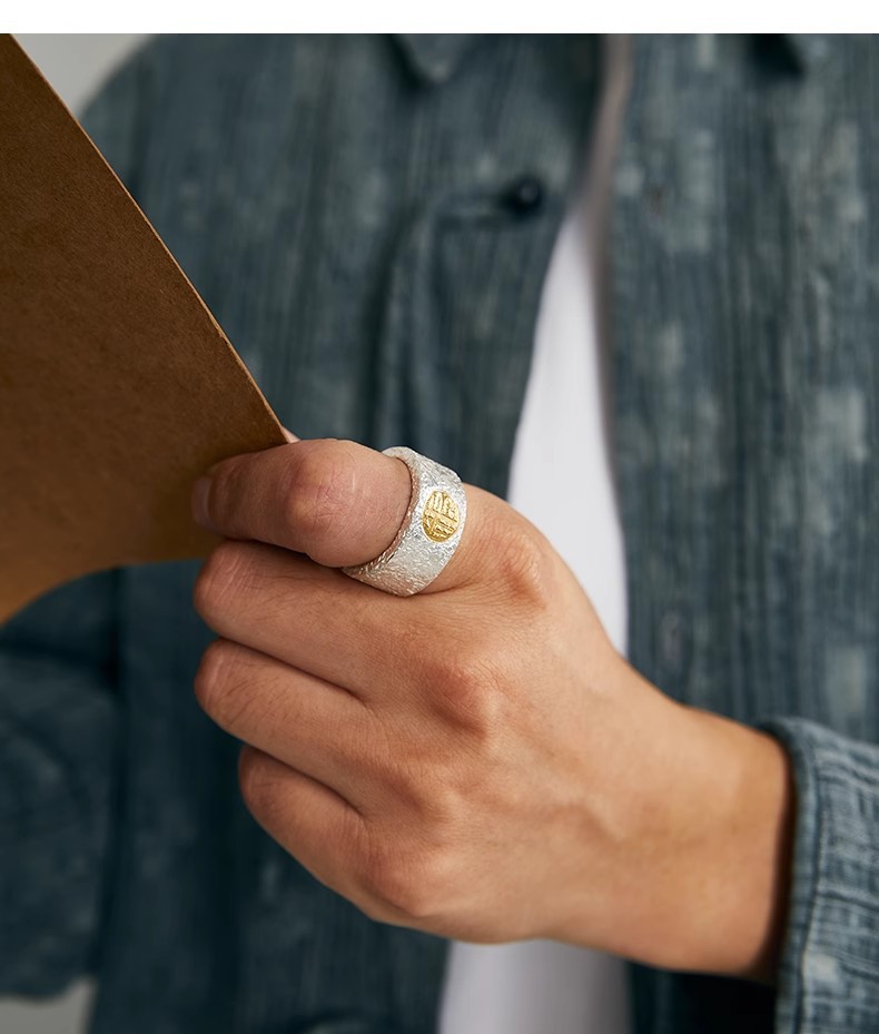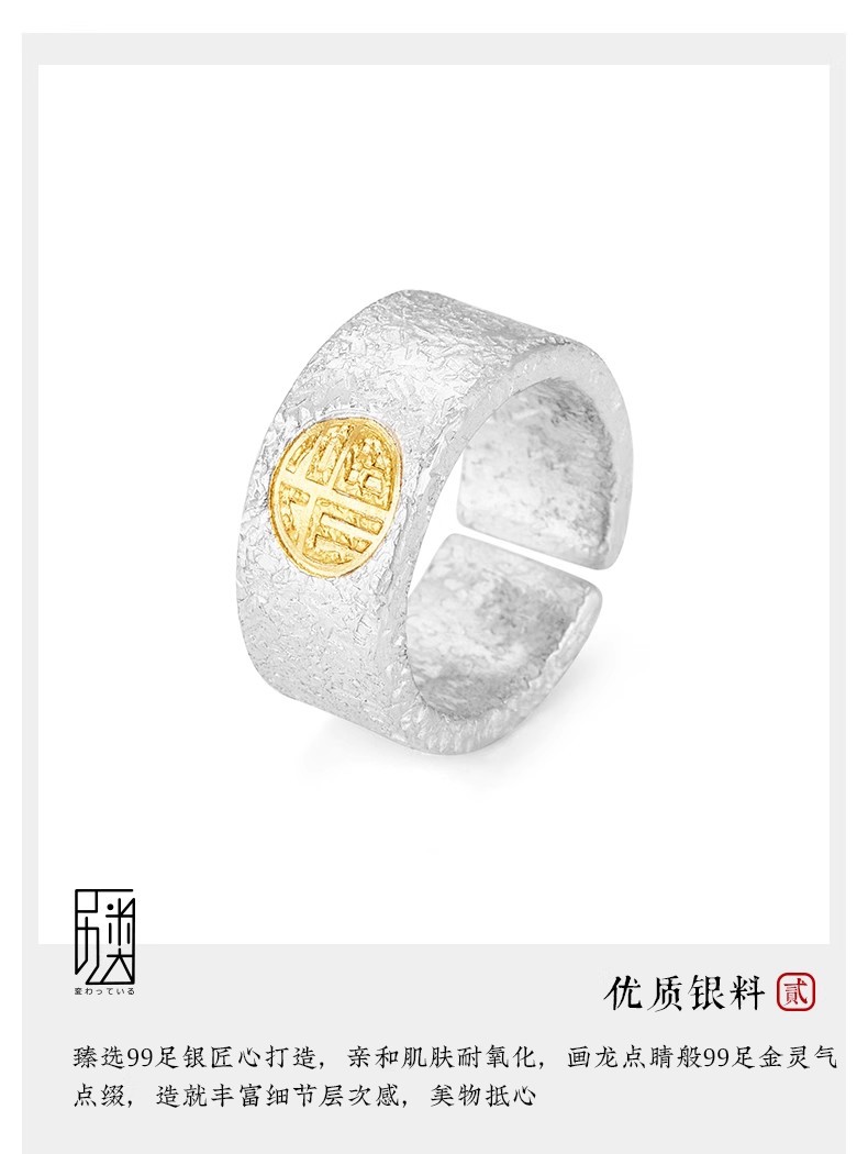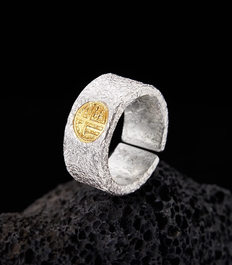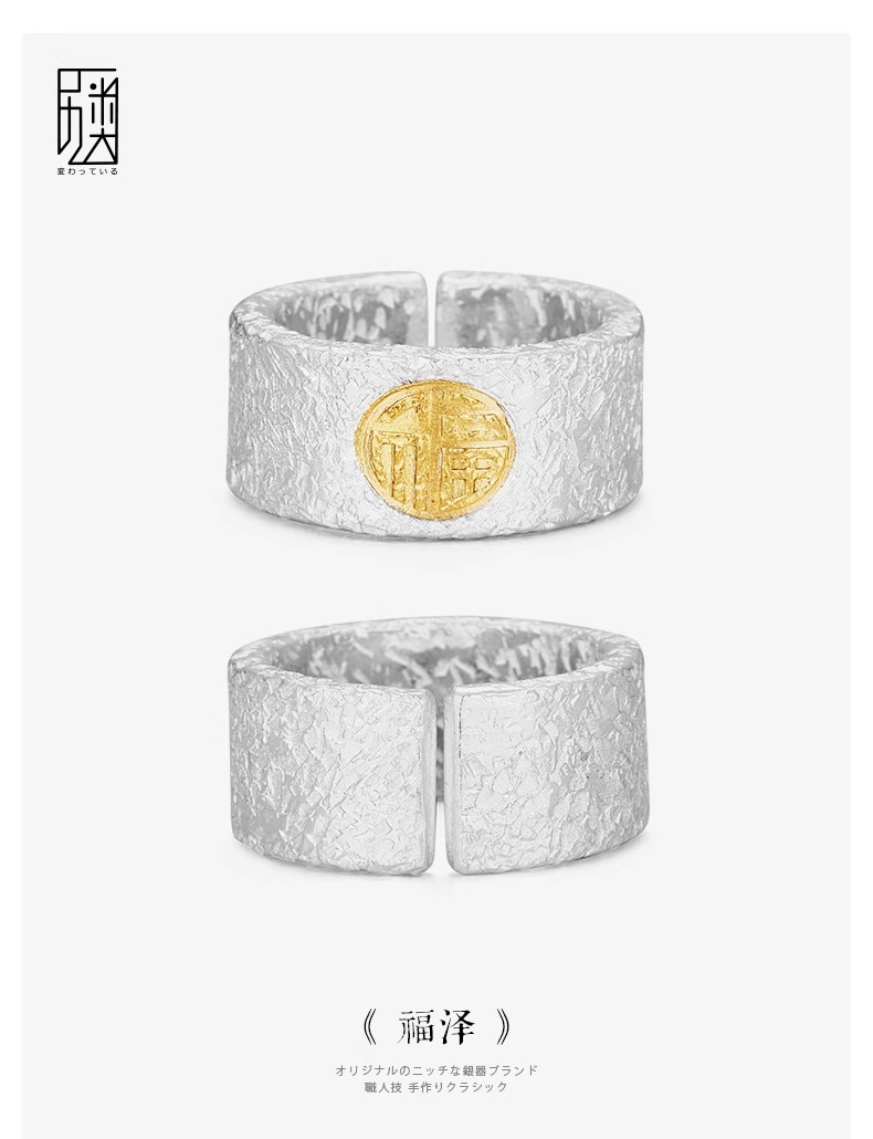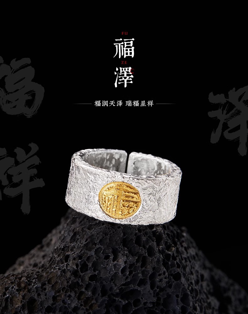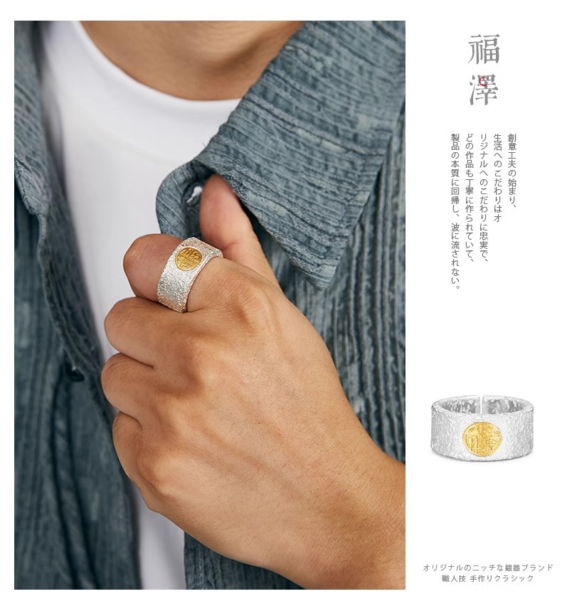福沢Iハンドメイドリングメンズシルバーゴールド福字オープン幅指リング99足銀はめ込み24K金中指戒子