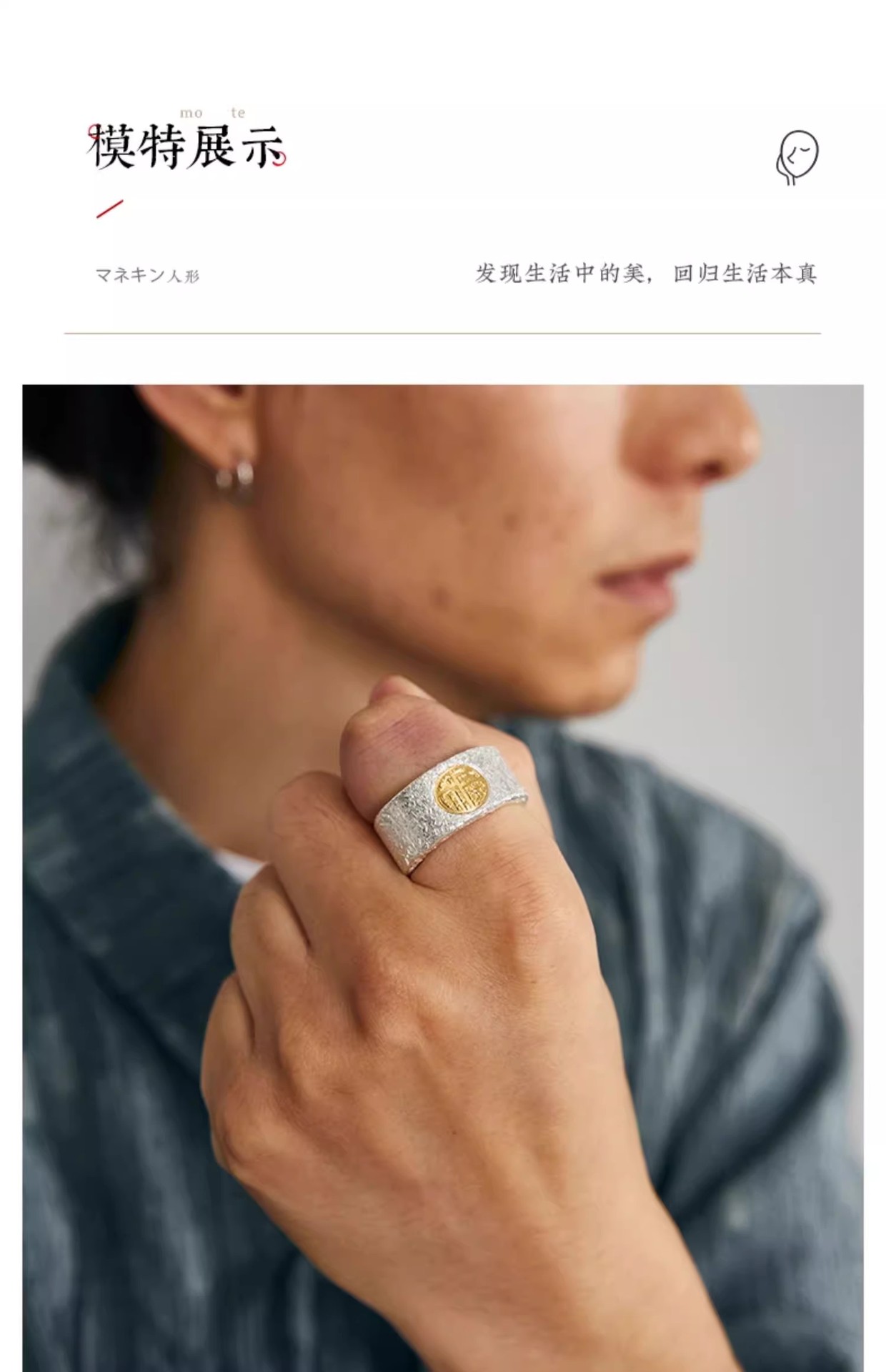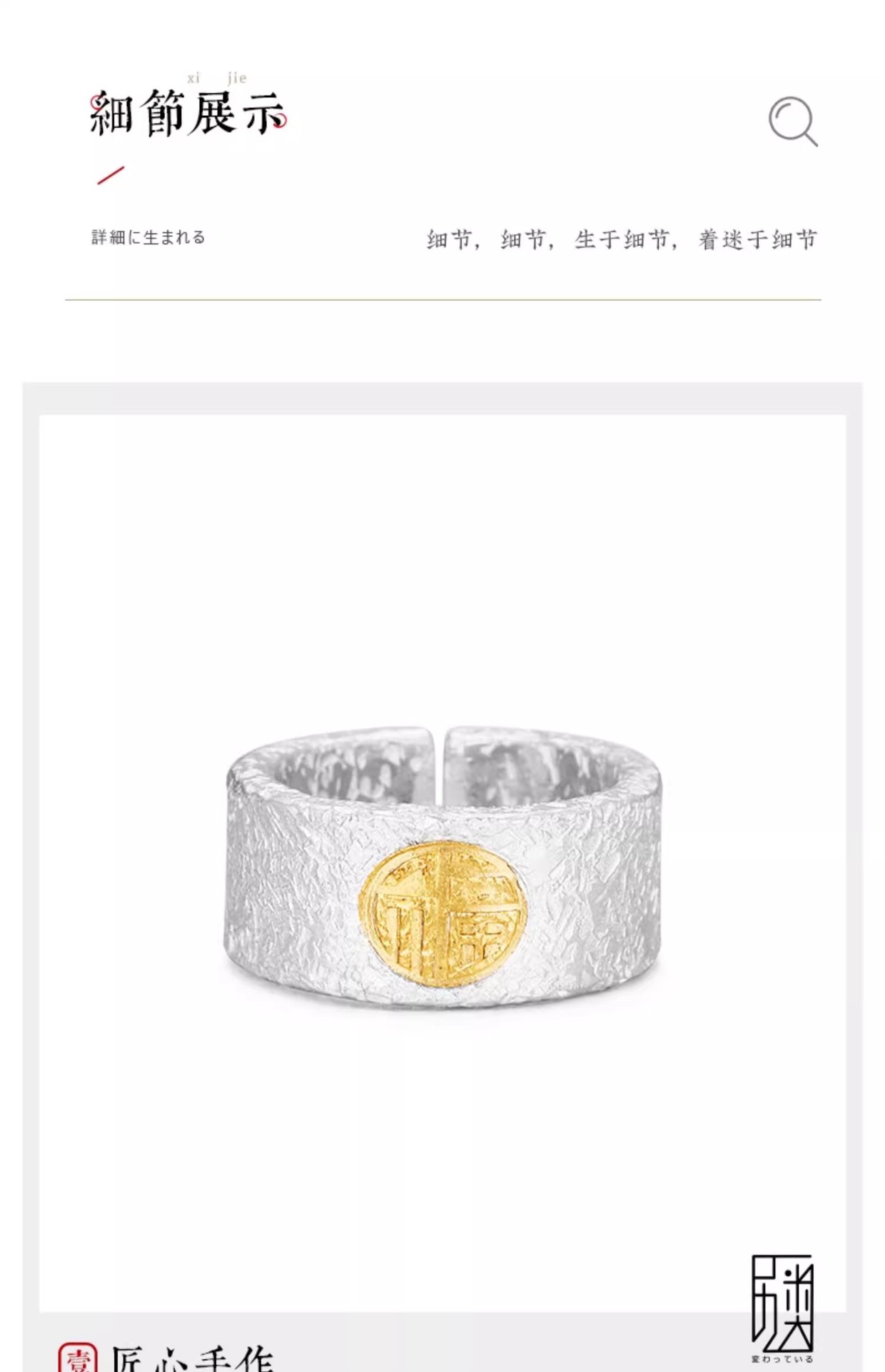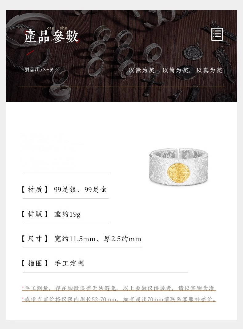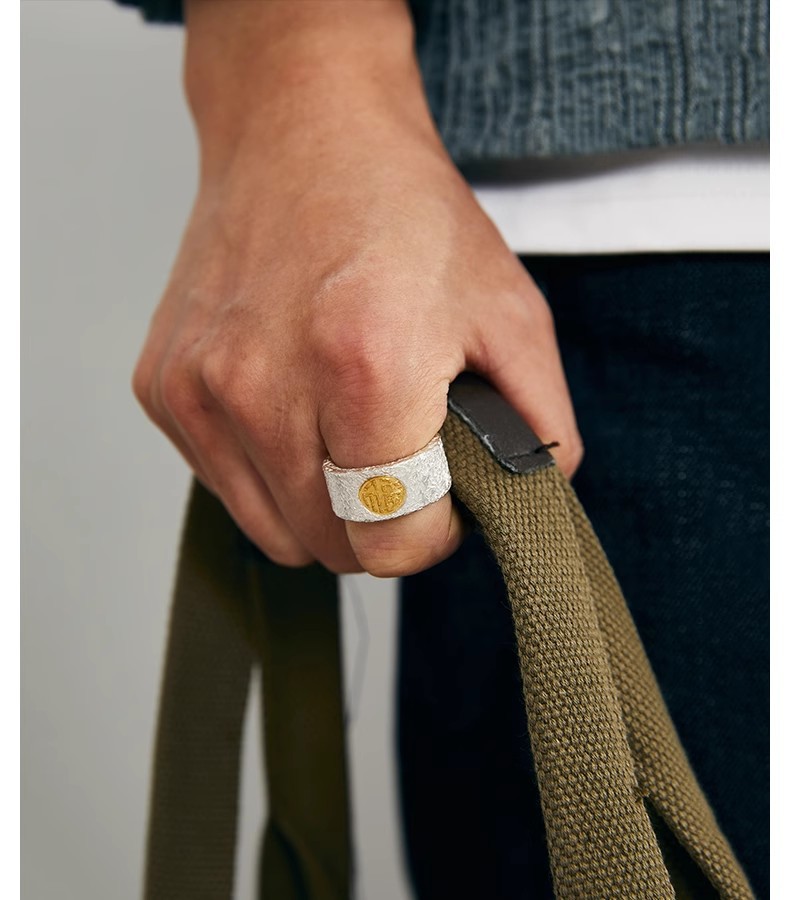 福沢Iハンドメイドリングメンズシルバーゴールド福字オープン幅指リング99足銀はめ込み24K金中指戒子