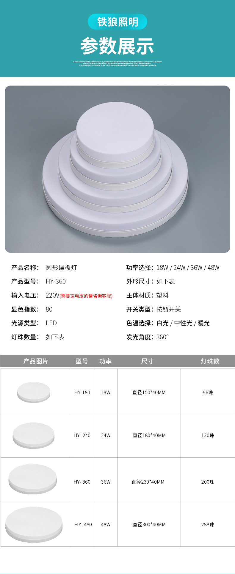 パワー 18W-¢150*40mm,24W-¢180*40mm,36W-¢230*40mm,48W-¢300*40mm