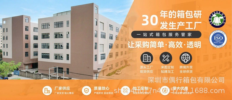 1、偶行箱包 专注30 年行业积淀,业务覆盖全球,集研发生产销售于一体,所有产品均获国家专利认证。
