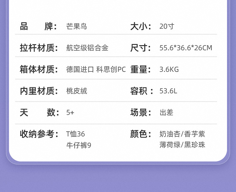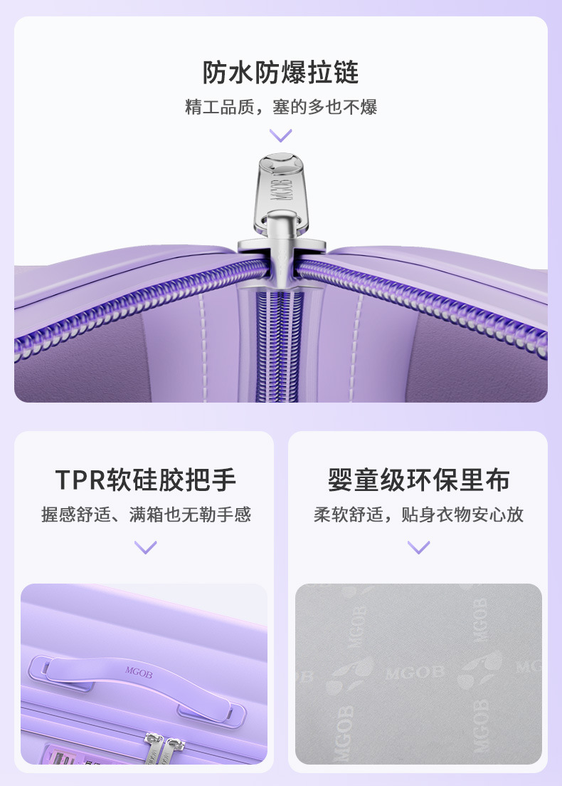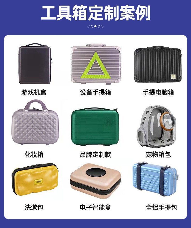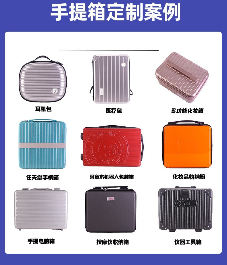2、拥有 PC、ABS、铝框、皮质等多材质产品线,全品类现货供应,支持图案、LOGO 定制,承接电商、实体店及企业定制加工需求。材质抗冲击、耐刮花,搭配 360°静音万向轮与加厚防爆拉链。产品覆盖登机箱、托运箱等全尺寸规格,推出商务简约、潮流撞色等多元风格,内置科学收纳系统,兼顾实用性与时尚感。