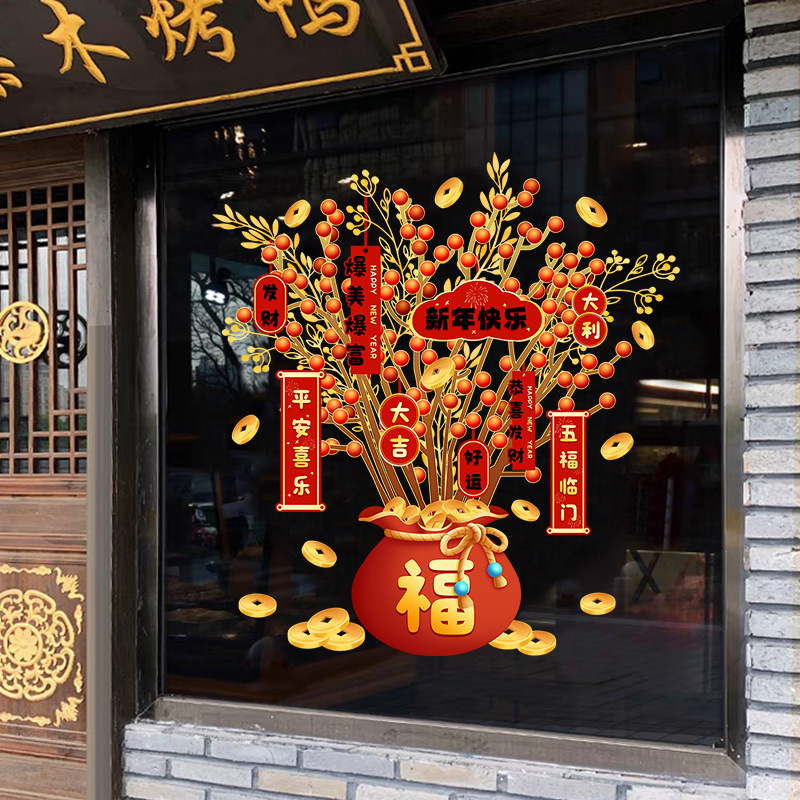 金持ちの木の速手代代代新年飾りガラスの壁貼り旧正月福貼り画静電気2024龍年シール窓花