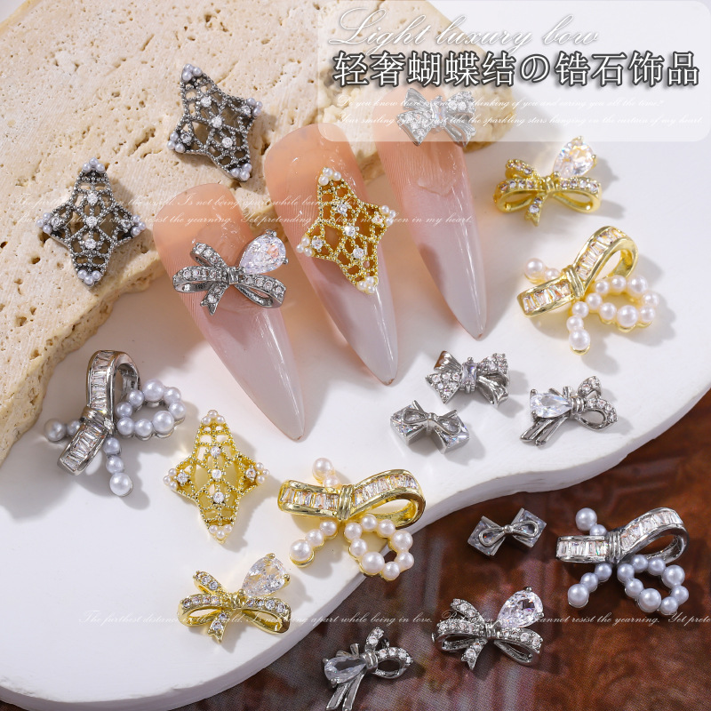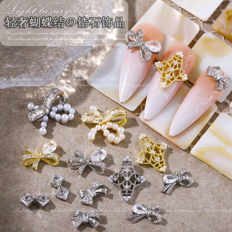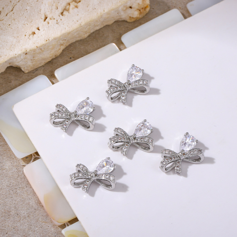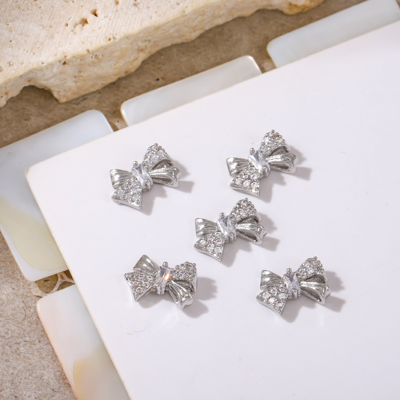 新款美甲饰品锆石侧边蝴蝶结银色立体飘带领结穿戴甲配饰金属钻饰