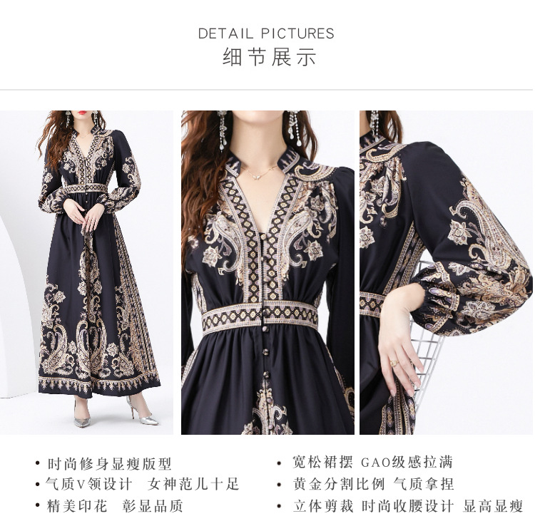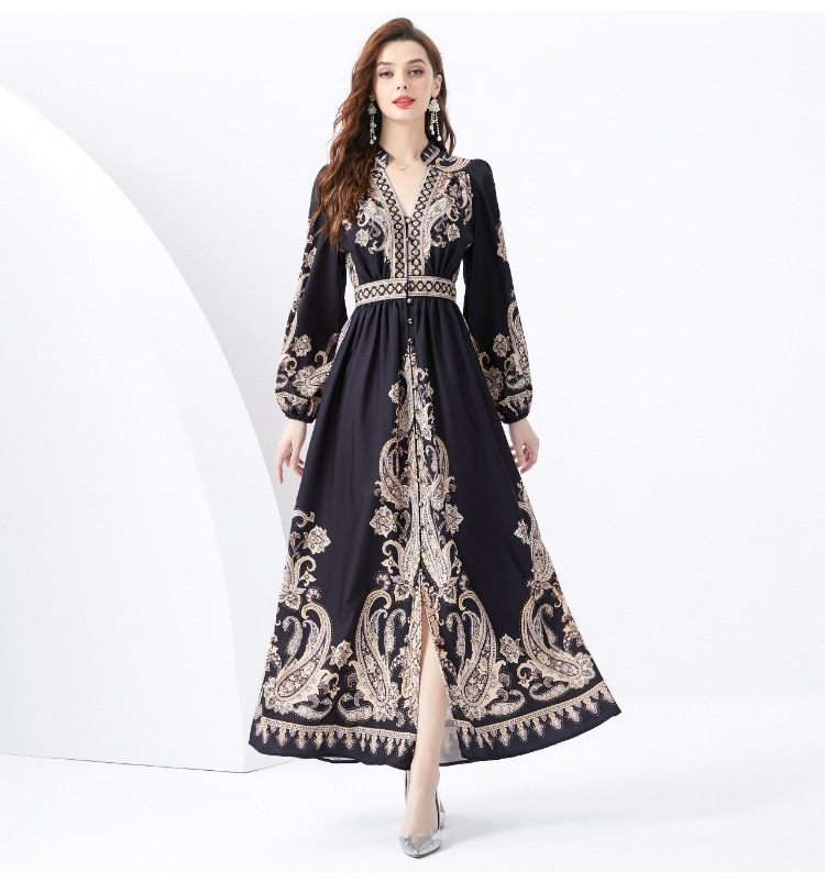 フレンチレトロ宮廷風プリント灯籠袖ロングドレスワンピース