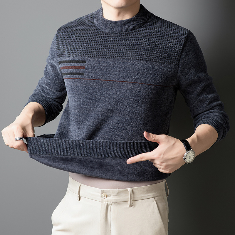 中年男士加绒加厚T恤冬季新款保暖时尚圆领针织打底内搭上衣外贸