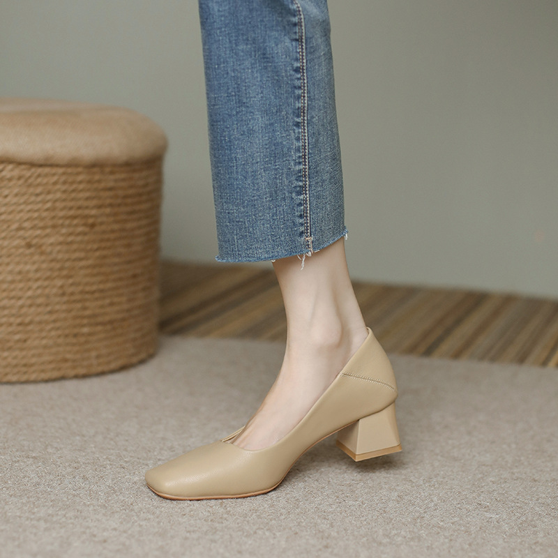 本革厚底ヒール女性の靴 2024 新しいミディアムヒールママの靴浅い口黒プロフェッショナルハイヒール面接仕事
