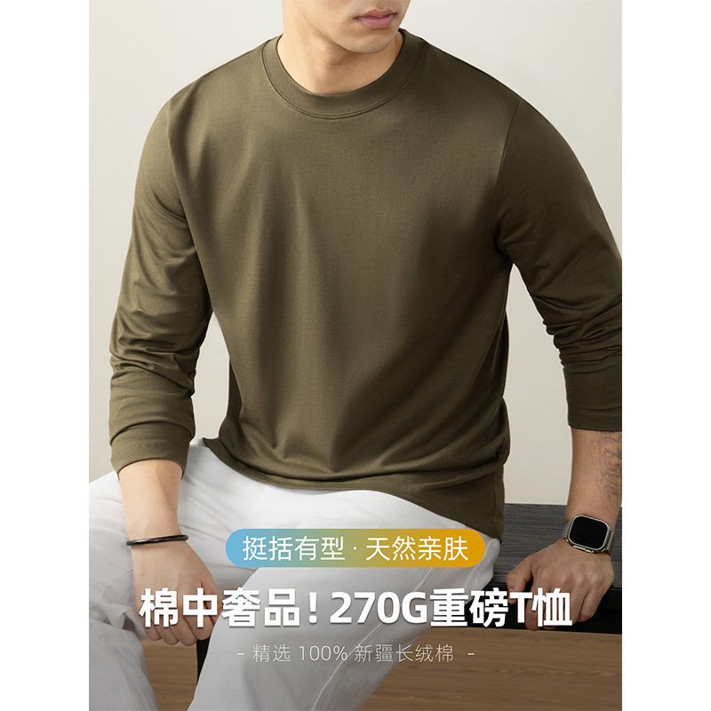 【100%新疆长绒棉】春秋季圆领长袖T恤男纯棉厚实不透点内搭体恤