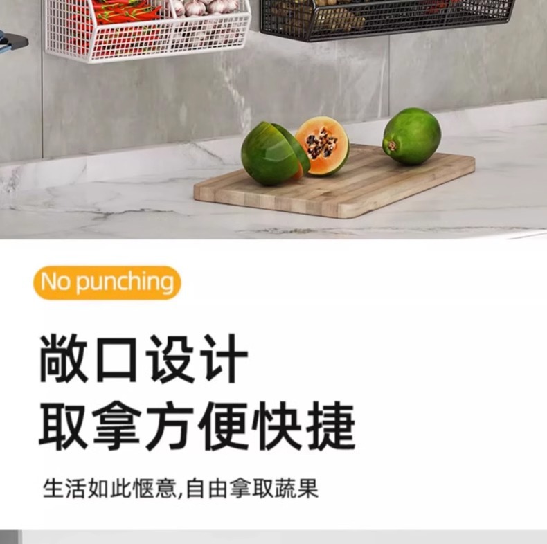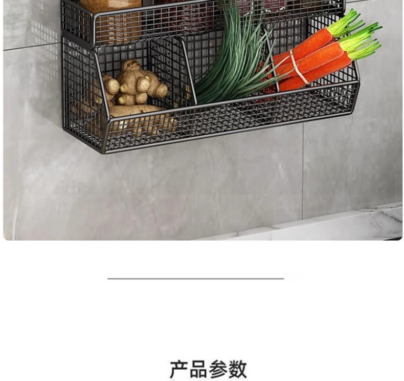 ネギのショウガのニンニクの収納箱のバスケットの壁掛けは穴を開けないで物棚の台所のショウガのニンニクの多機能の台所の調味料棚を置きます。