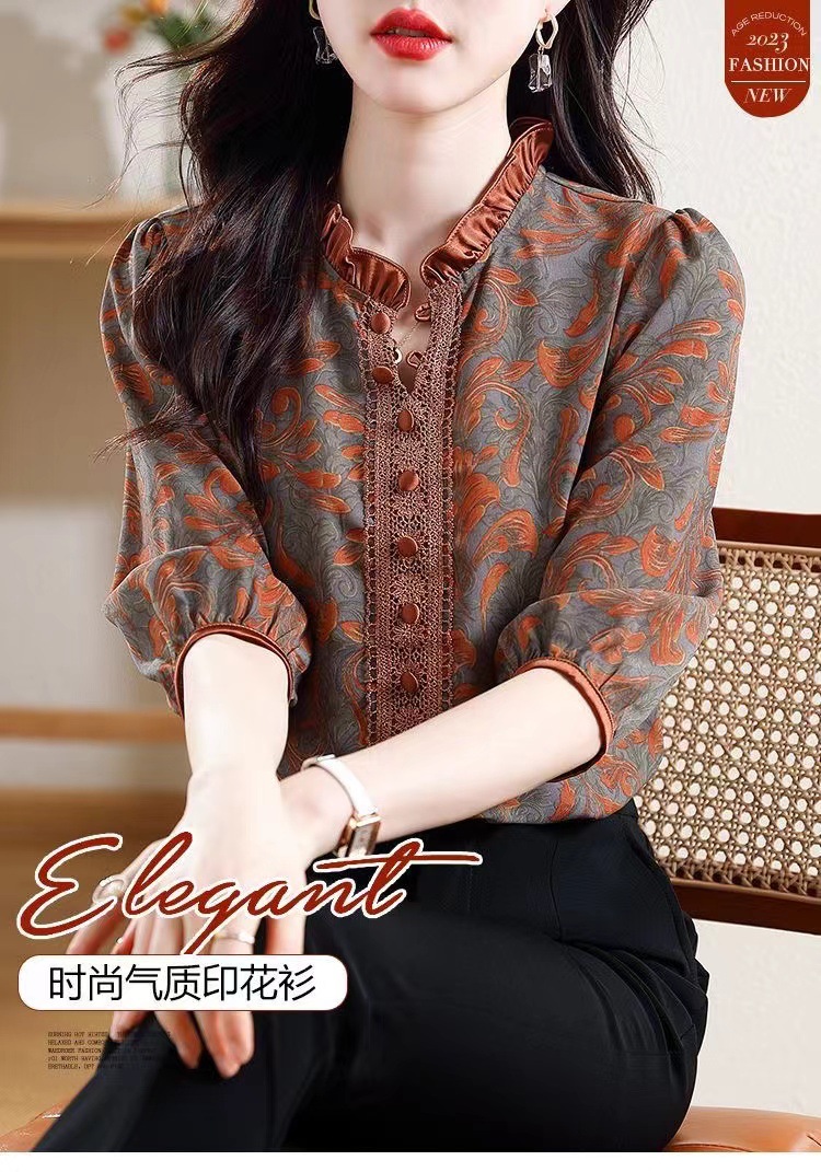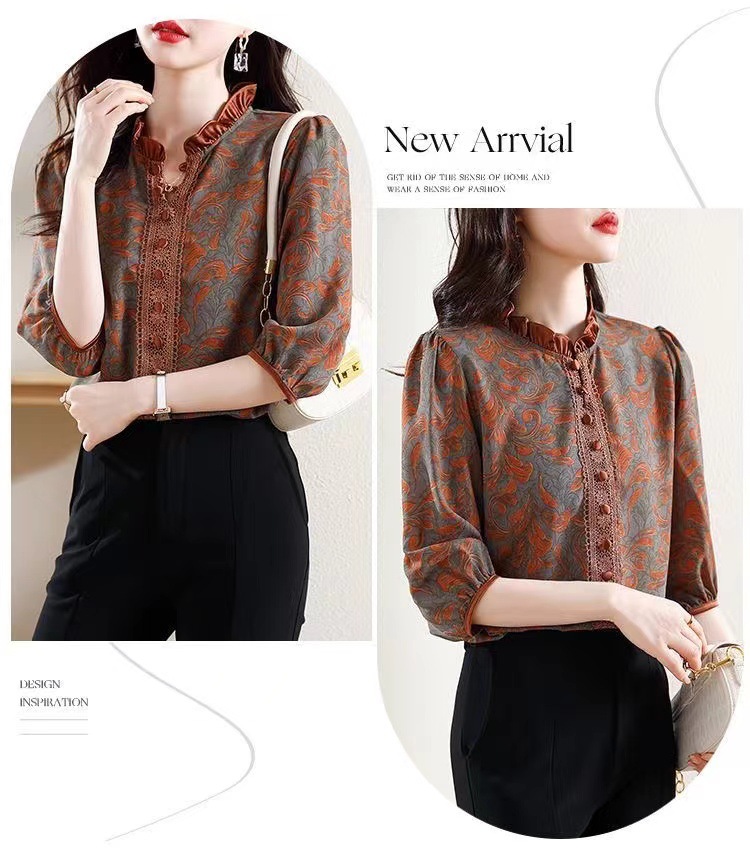 ファッショナブルなプリントラペルシャツ、レトロな女性用ミッドスリーブシャツ、スリムで体型をカバーする薄手のシャツ