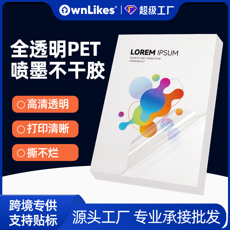 インクジェットPET透明粘着印刷用紙、破れにくいA4サイズ、自己粘着印刷、高透明ラベルステッカー、卸売、裏面粘着