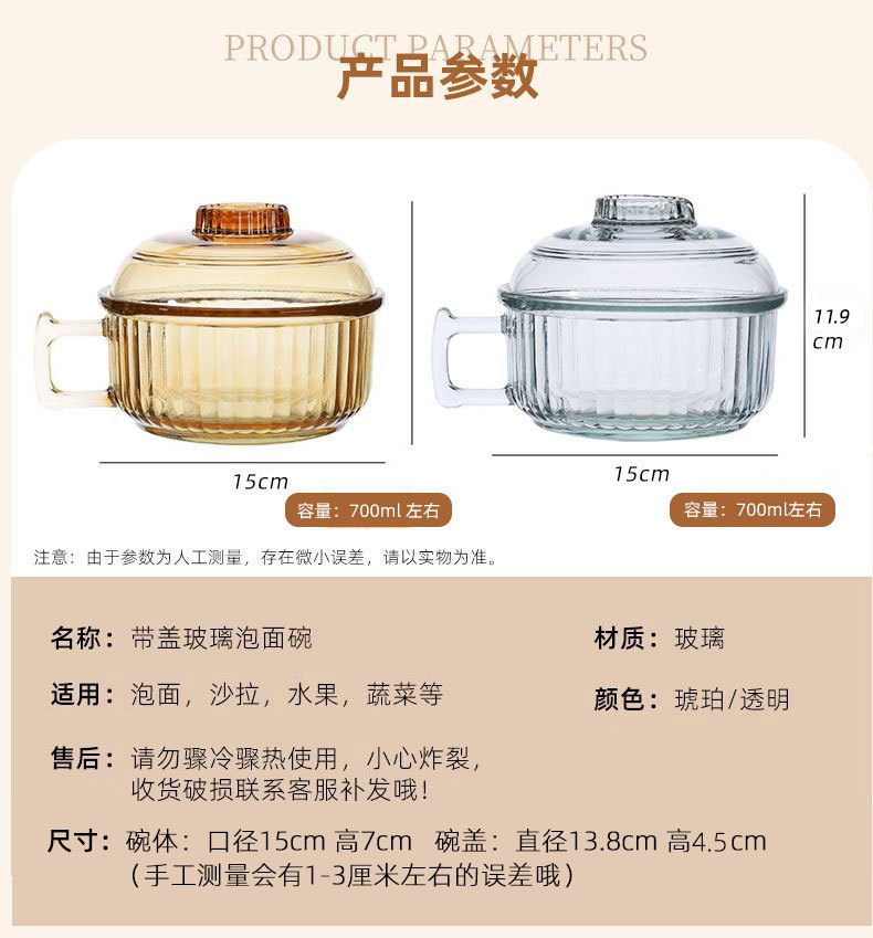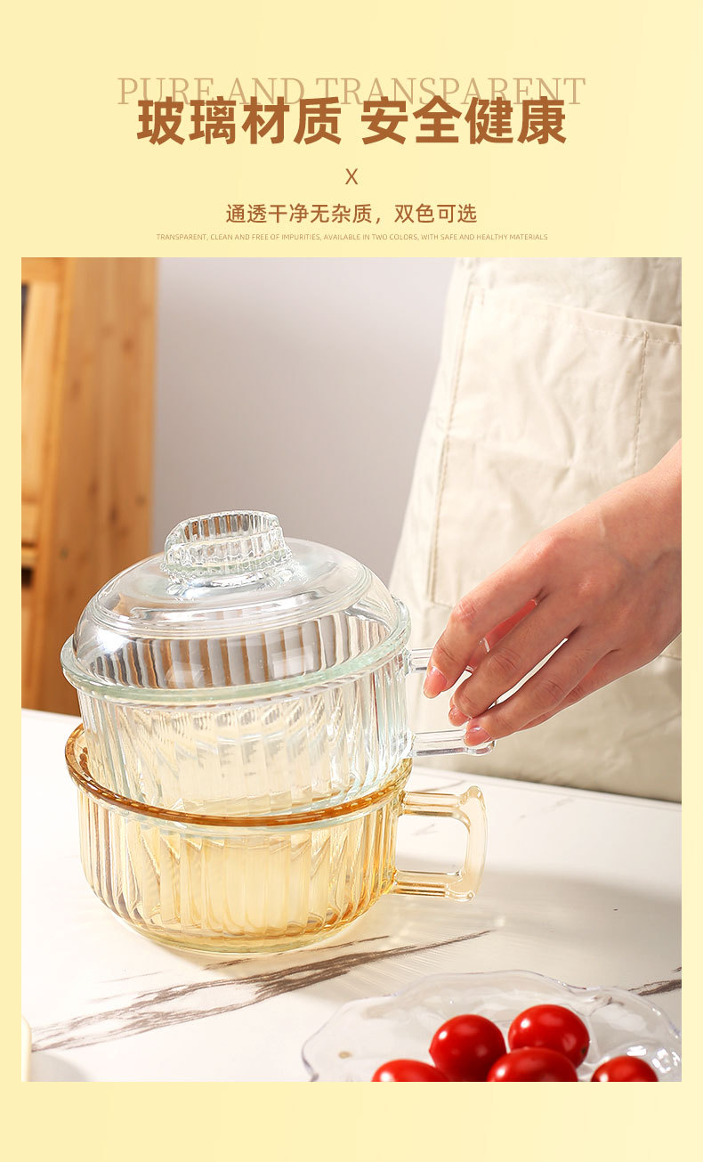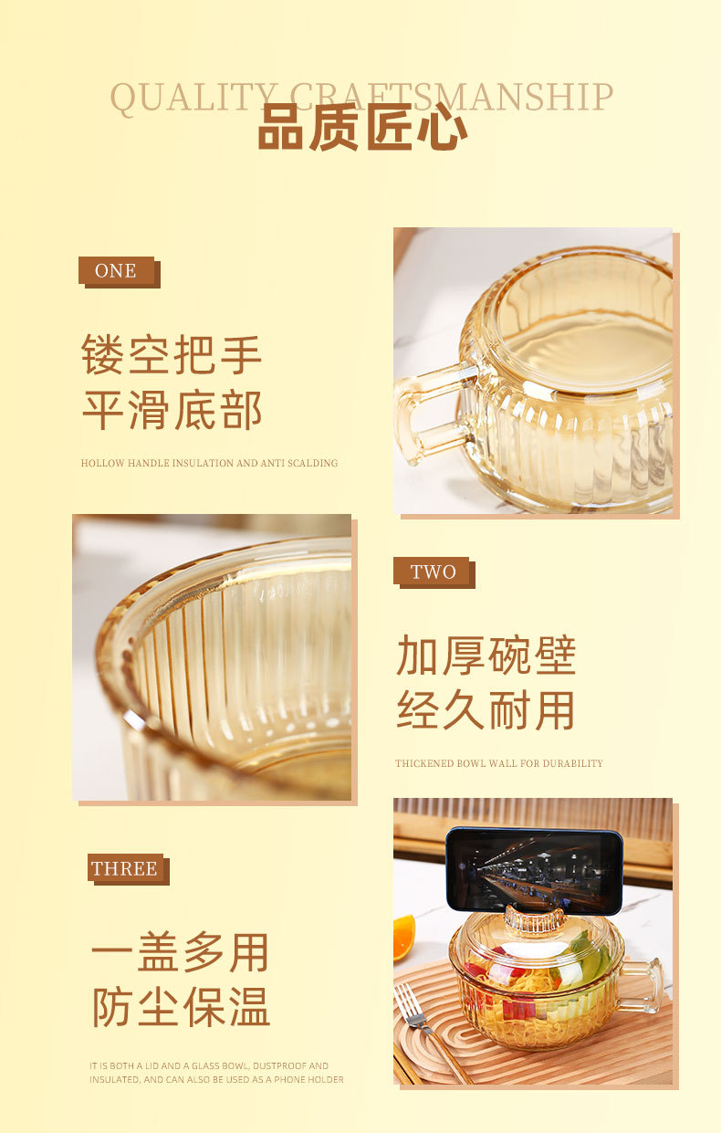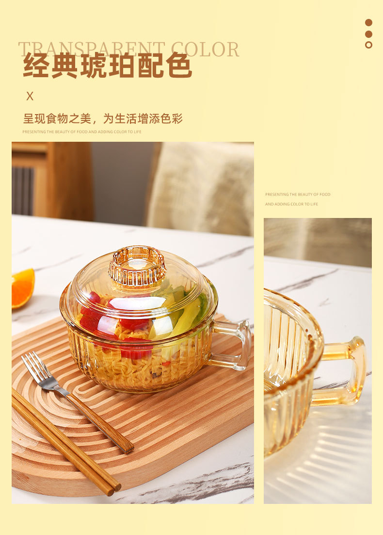 家用宿舍双耳防烫玻璃碗玻璃煲带盖子加厚茶色泡面碗汤碗果蔬碗
