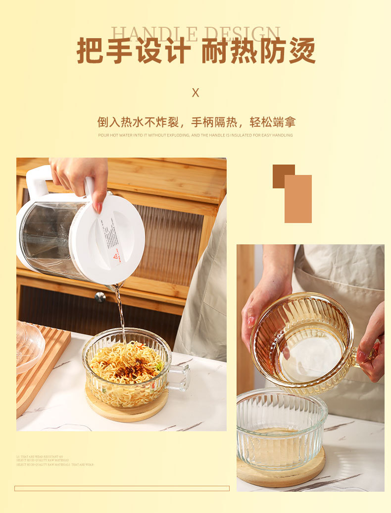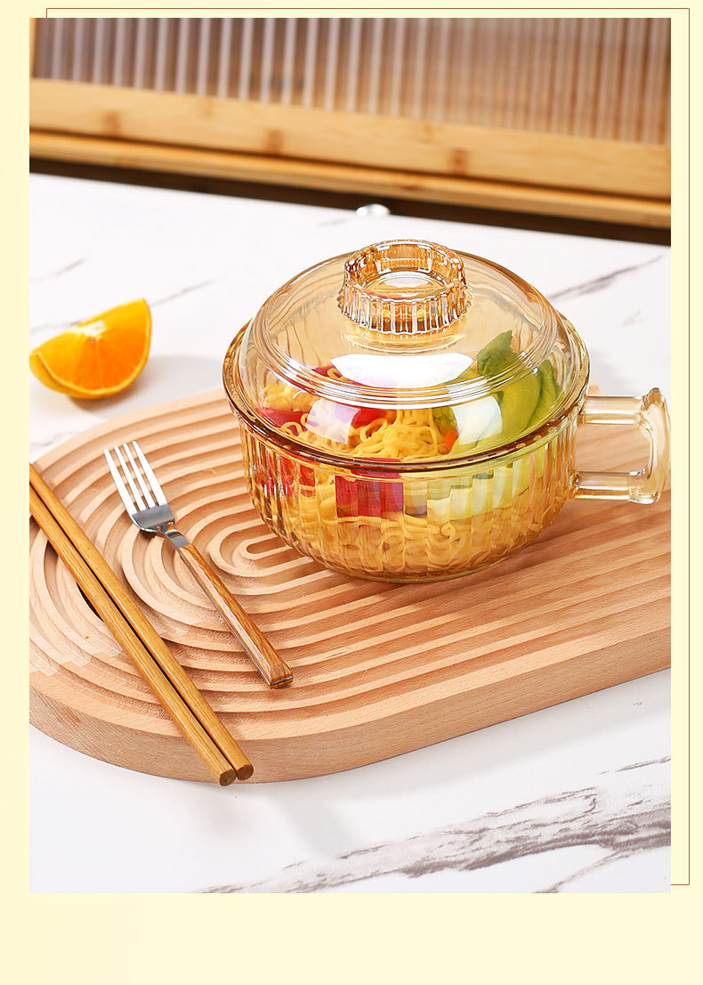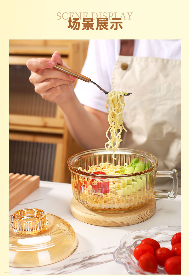 ハンドル付き高見えインスタントラーメンガラスボウル、火傷防止学生寮、蓋付き大容量透明インスタントラーメンボウル卸売