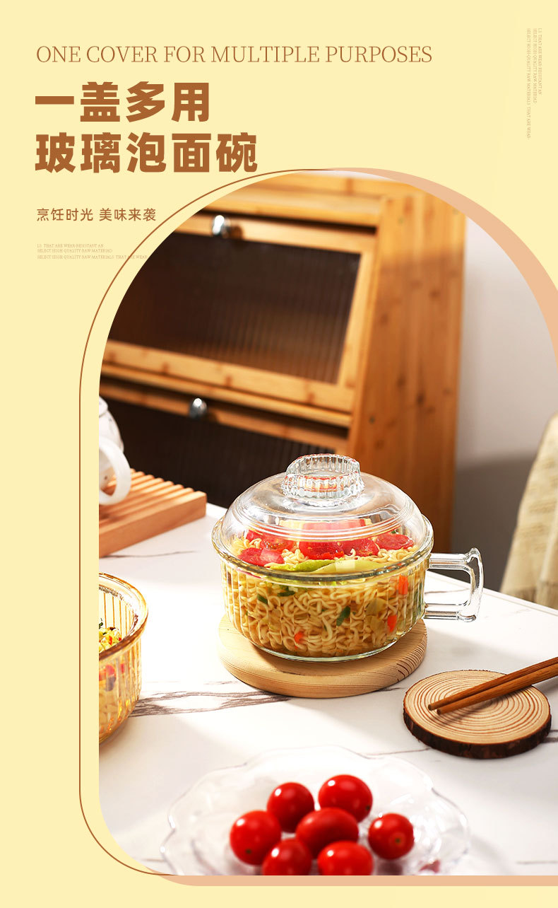 カップラーメンガラスボウルハンドル付パーマ防止家庭用カバー付き大容量透明専用カップラーメンボウル