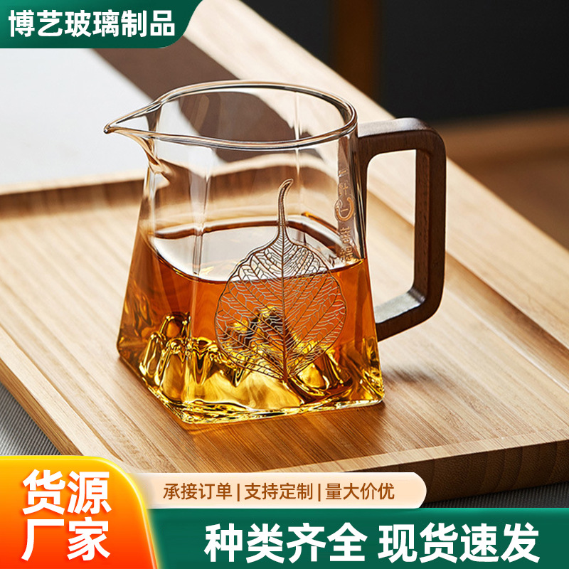 四方观山公道杯 木柄高硼硅玻璃公道杯创意方底观山造型分茶器