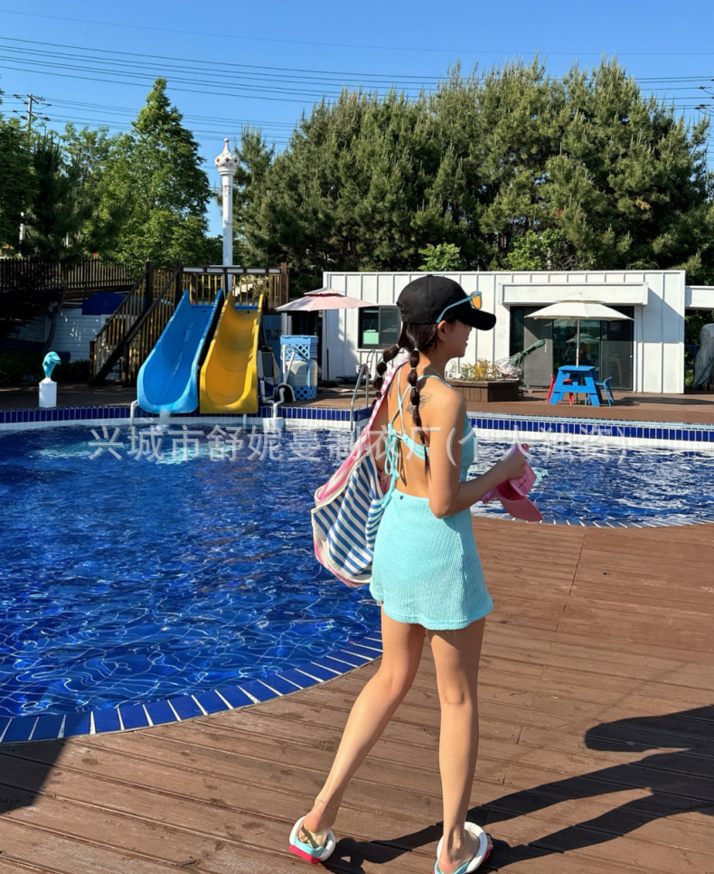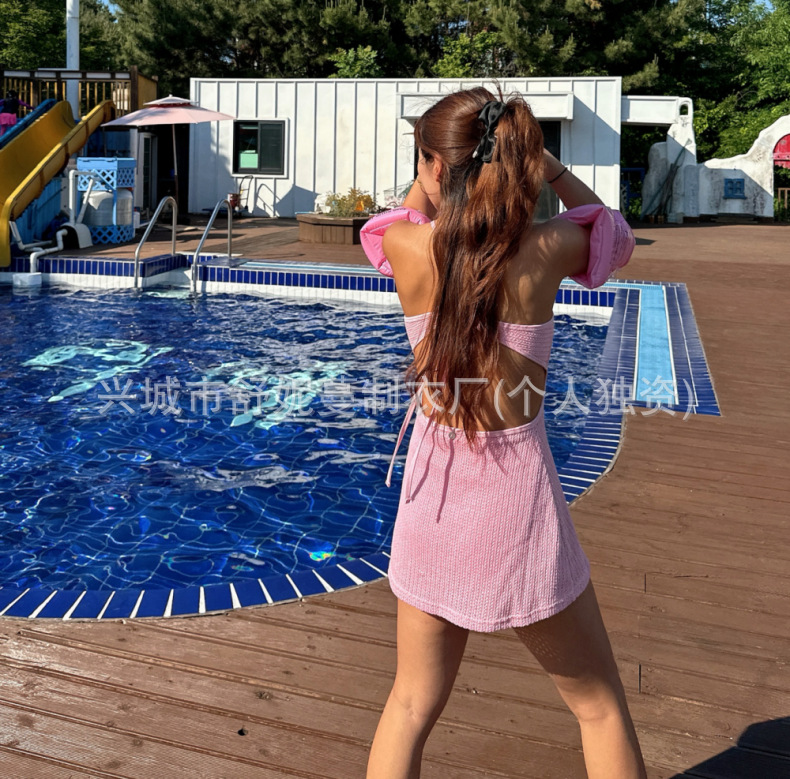 水着レディース高級感純欲風アウトレット純色ビキニニットワンピーススカート式首掛け水着インスタ風