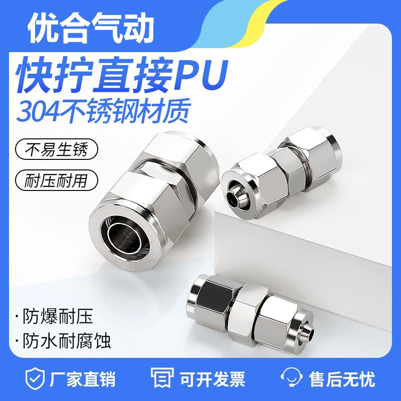 304不锈钢快拧直通气动接头PU尼龙管快速锁母中间接头φ6/8